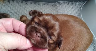Petite and sparkly personality. Always in a good mood. Her amazing affectionate personality passes on to her beautiful puppies.