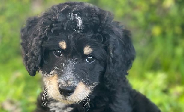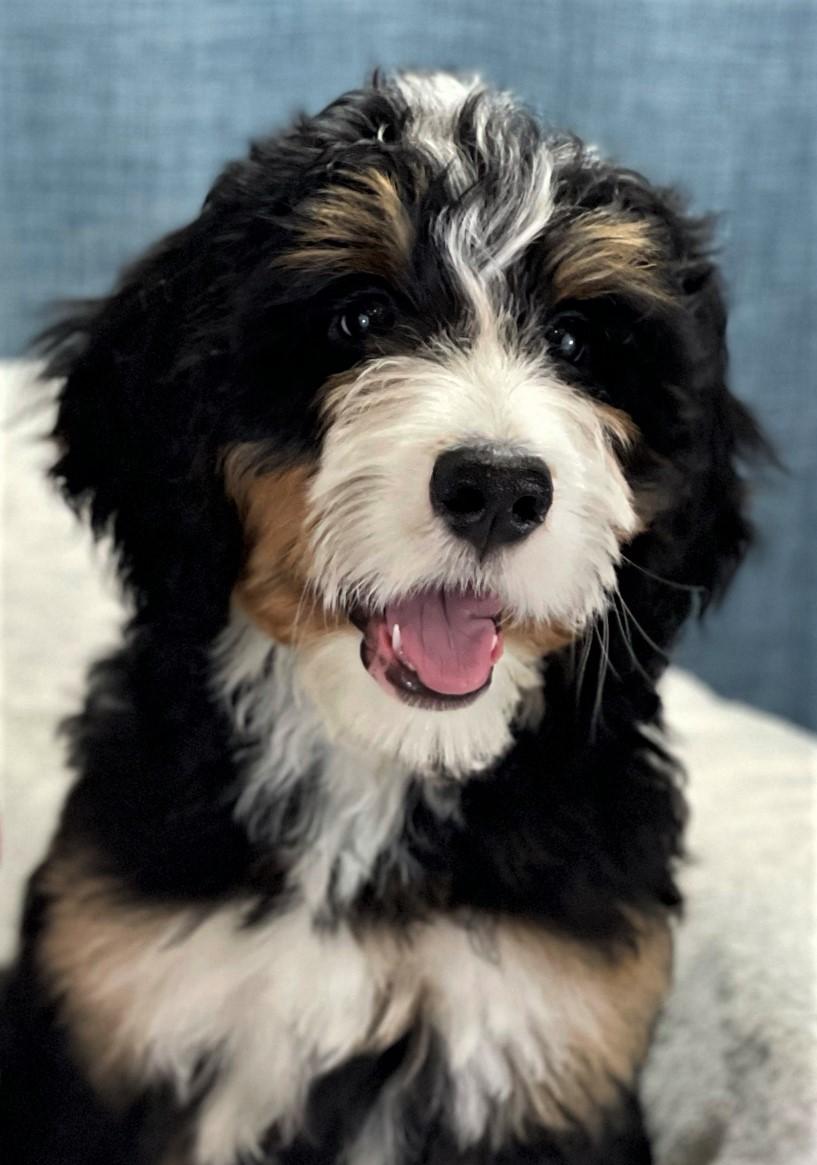 Olive is the perfect family dog and we adore her! She is a mini/medium tricolor F1b Bernedoodle. She is sweet and has been very easy to train. She is calm and friendly both in the house and out. I am so excited that she will be passing on her good looks, excellent temperament, and healthy genetics and structure to her puppies!