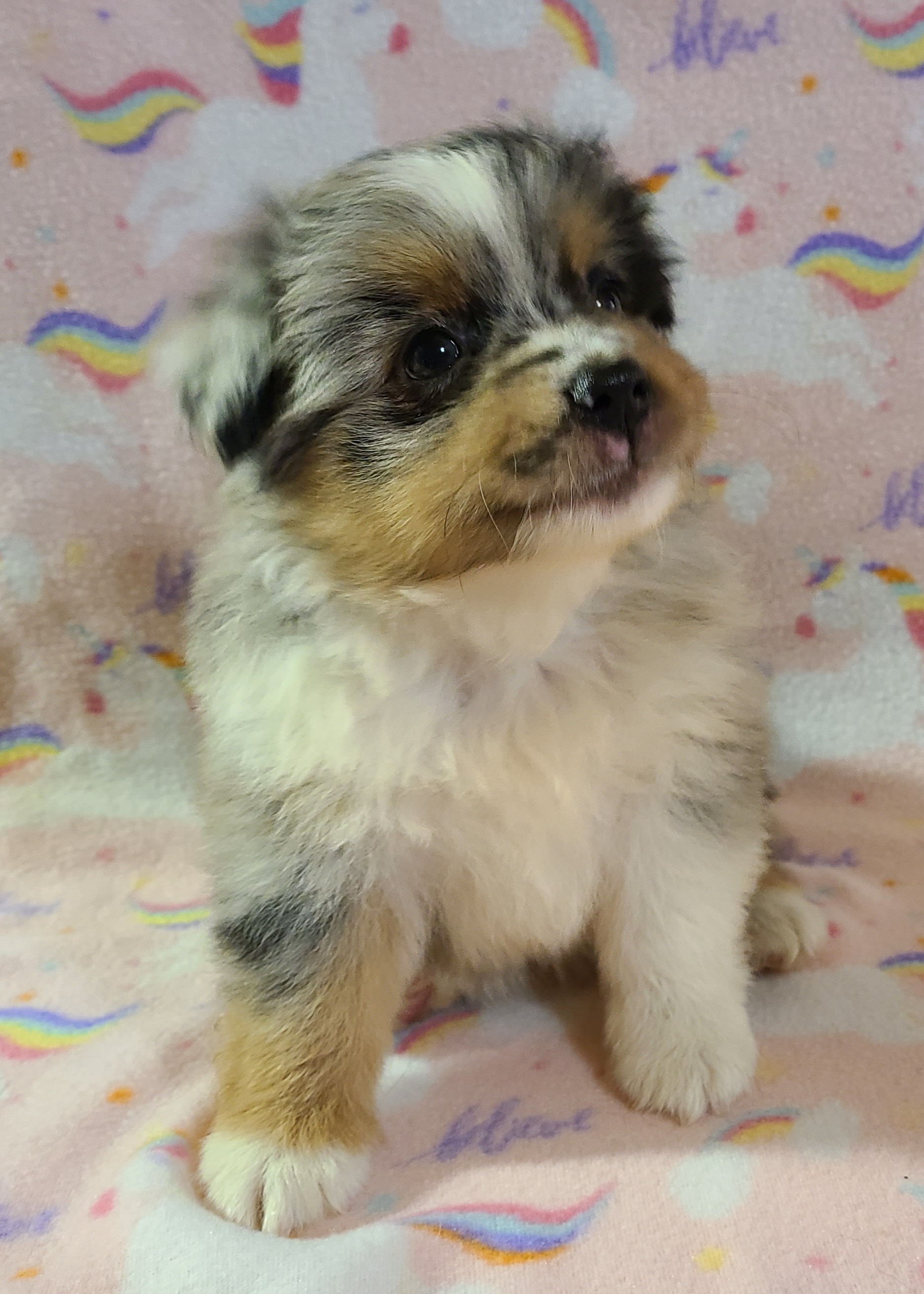 Our Miniature Australian Shepherd puppies include blue merle, red merle, red, and black. Toy Australian Shepherd puppies include red, black, blue merle, and red merle. Colors will vary depending on the parent dogs.