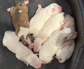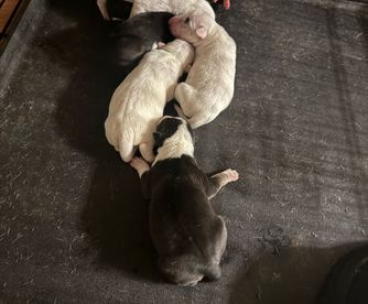 Our puppies include black brindle and white and white. Colors will vary depending on the parent dogs.