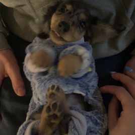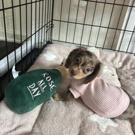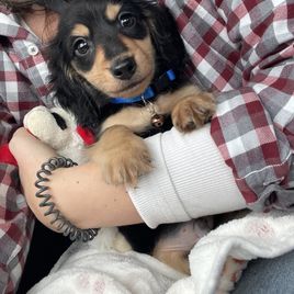 Antoinette was great to work with! She sent me weekly updates on my puppy and photos and videos throughout, and helped me pick a puppy that would work well with my family. He arrived with everything you can think of to get through that first week of new puppyhood, and our puppy (now named Lewis) has clearly been raised with care. Very potty trained for a 8 week old that loves his naps and solo playtime along with cuddles. If Lewis wasn't my second doxie in the house I would definitely work with Antoinette again and will be recommending her to anyone who wants a doxie in their life!