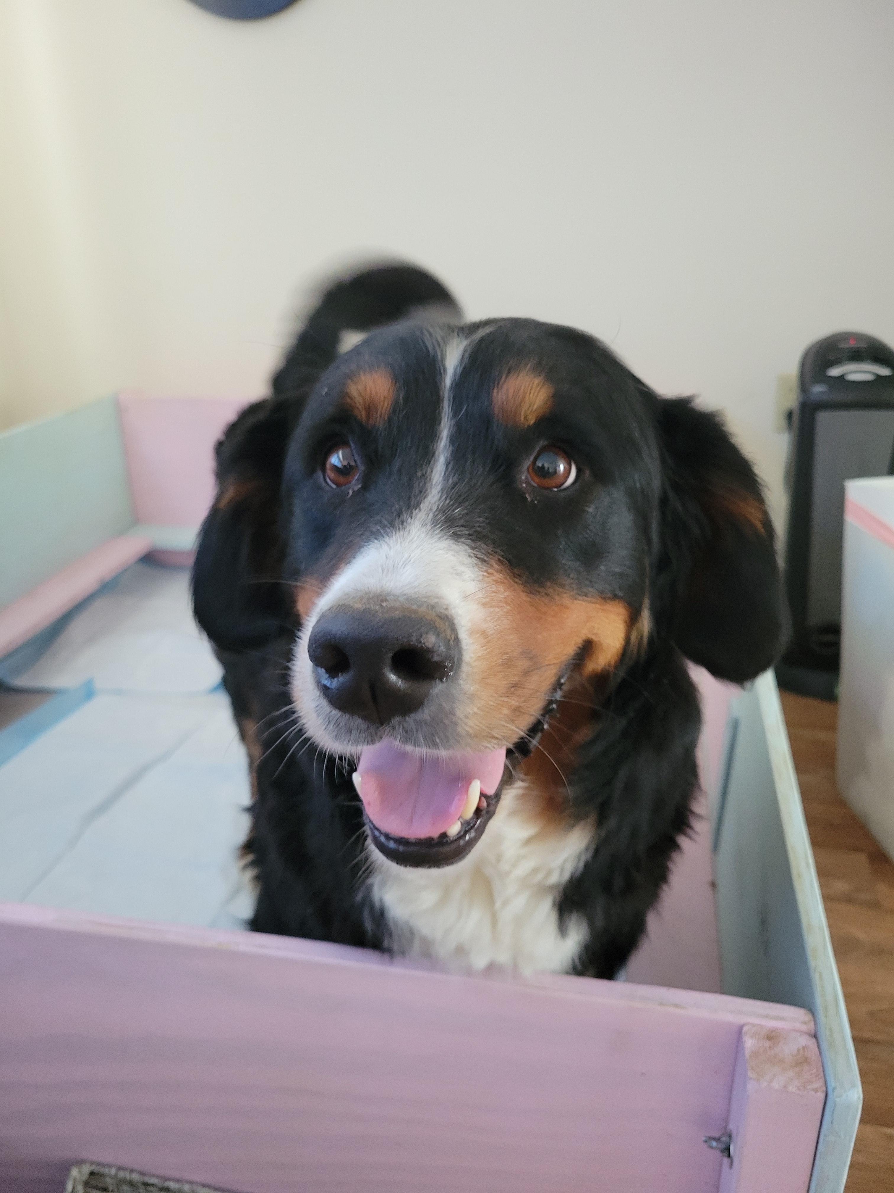 Mouse is very small for her breed but that doesn't stop her from keeping up with her larger sisters. She loves agility courses and playing outside. She has an incredible sense of smell and plays hide and seek with people in the woods. Her parents were purebred Berners (no health or hip issues) and it shows in her markings and loving demeanor.