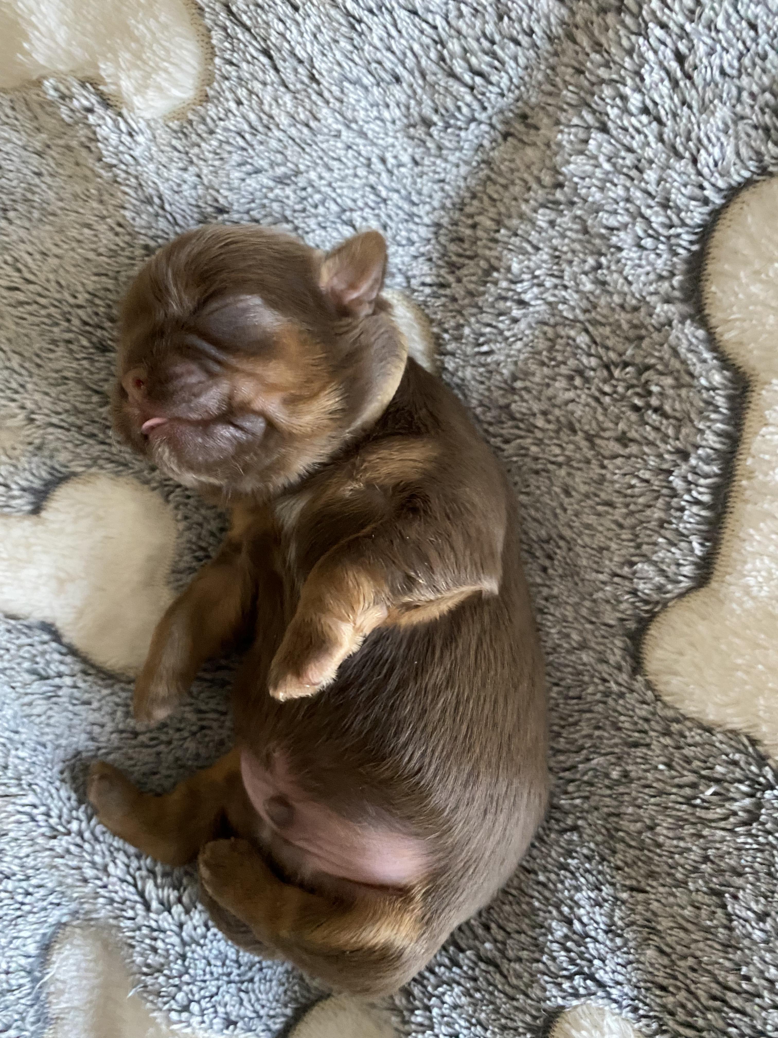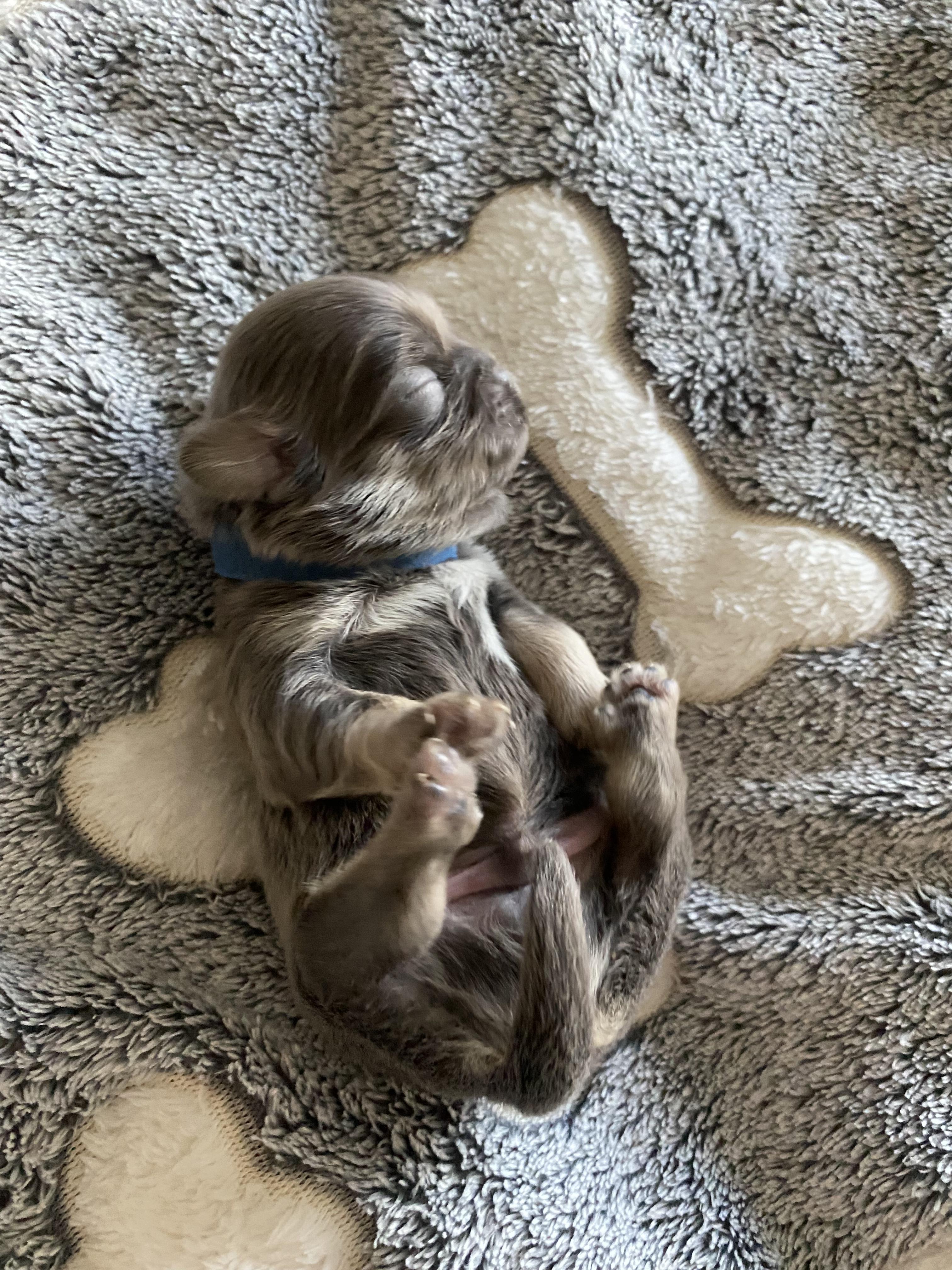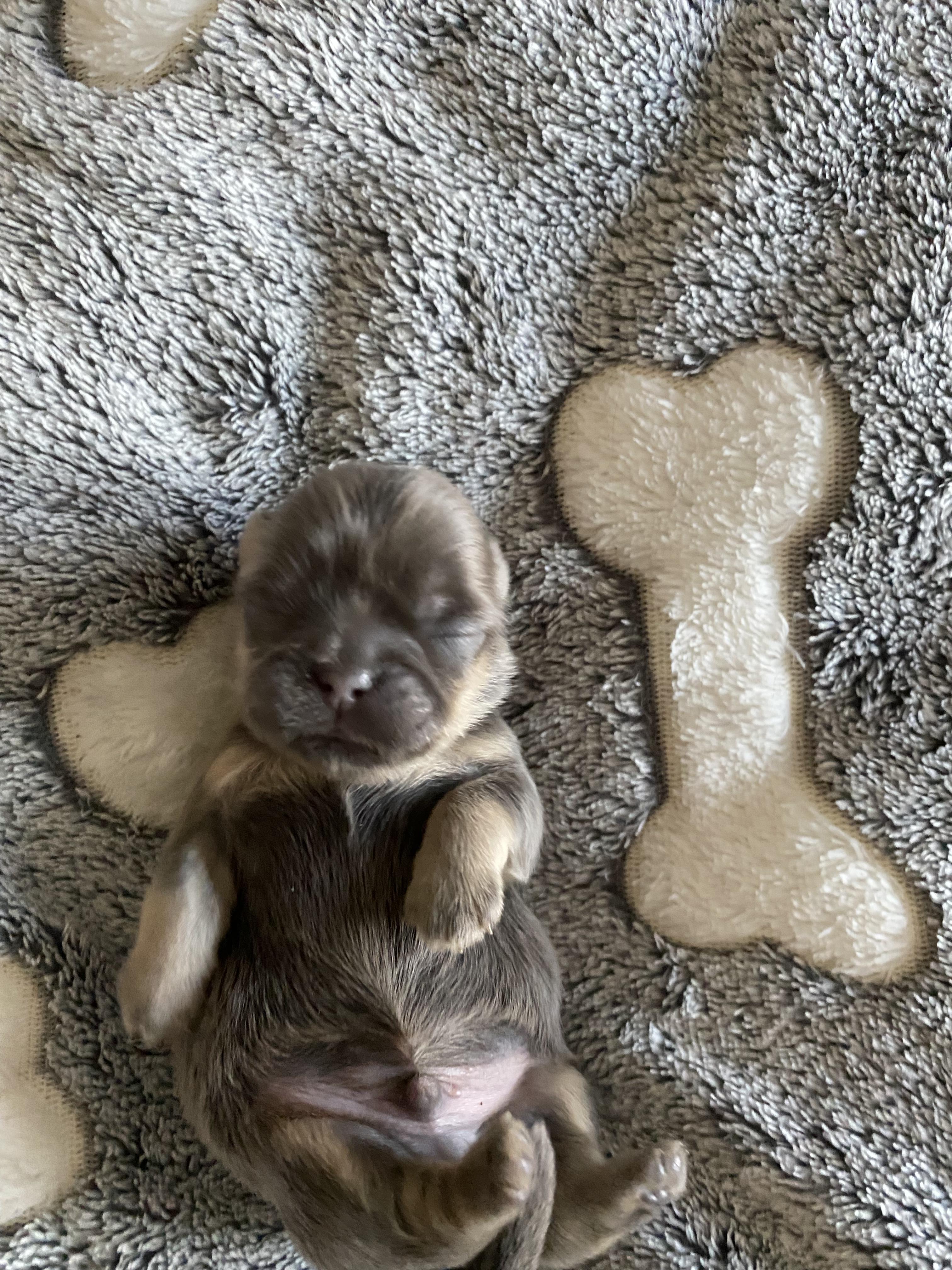 My babies are with me till they are 12 weeks old so they transition better to their new homes. They come with a copy of their own dna work ups if done, microchipped, typically 2 sets shots, 2 neopar shots, dewormed and treated with a coccidia preventative as well as a take home bag, food, thier vet clearance and akc paper work. Their bottoms are groomed to keep poop from sticking as well.