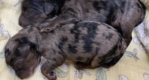 Our Poodle puppies include apricot, black, red, and phantom. Aussiedoodle puppies include blue merle and red merle. Colors will vary depending on the parent dogs.