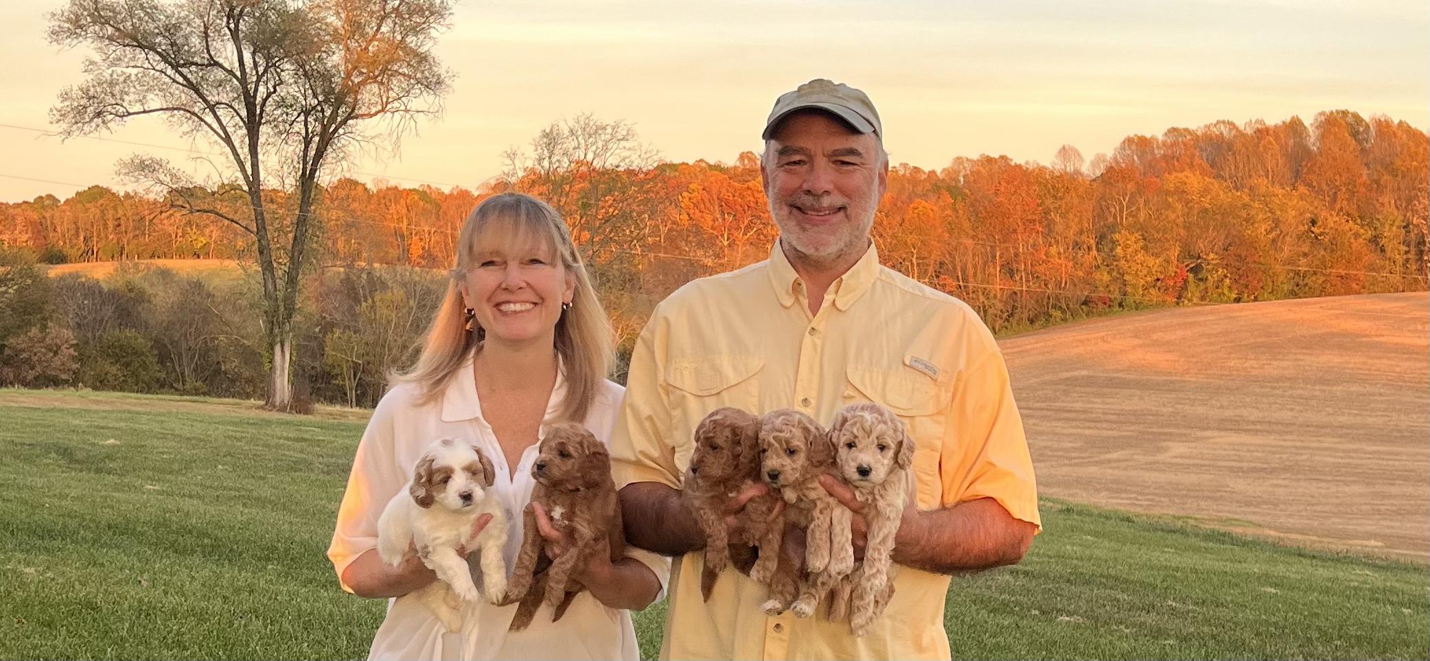 When our beloved golden retriever Sunny passed away, Joe and I decided to chase two dreams simultaneously! We wanted to share the incredible healing and love that dogs offer by becoming reputable breeders of pups with high intelligence, hybrid vigor, therapy-dog temperaments, and hypoallergenic qualities! Plus, we infused a touch of that wonderful golden retriever spirit—without all the shedding!