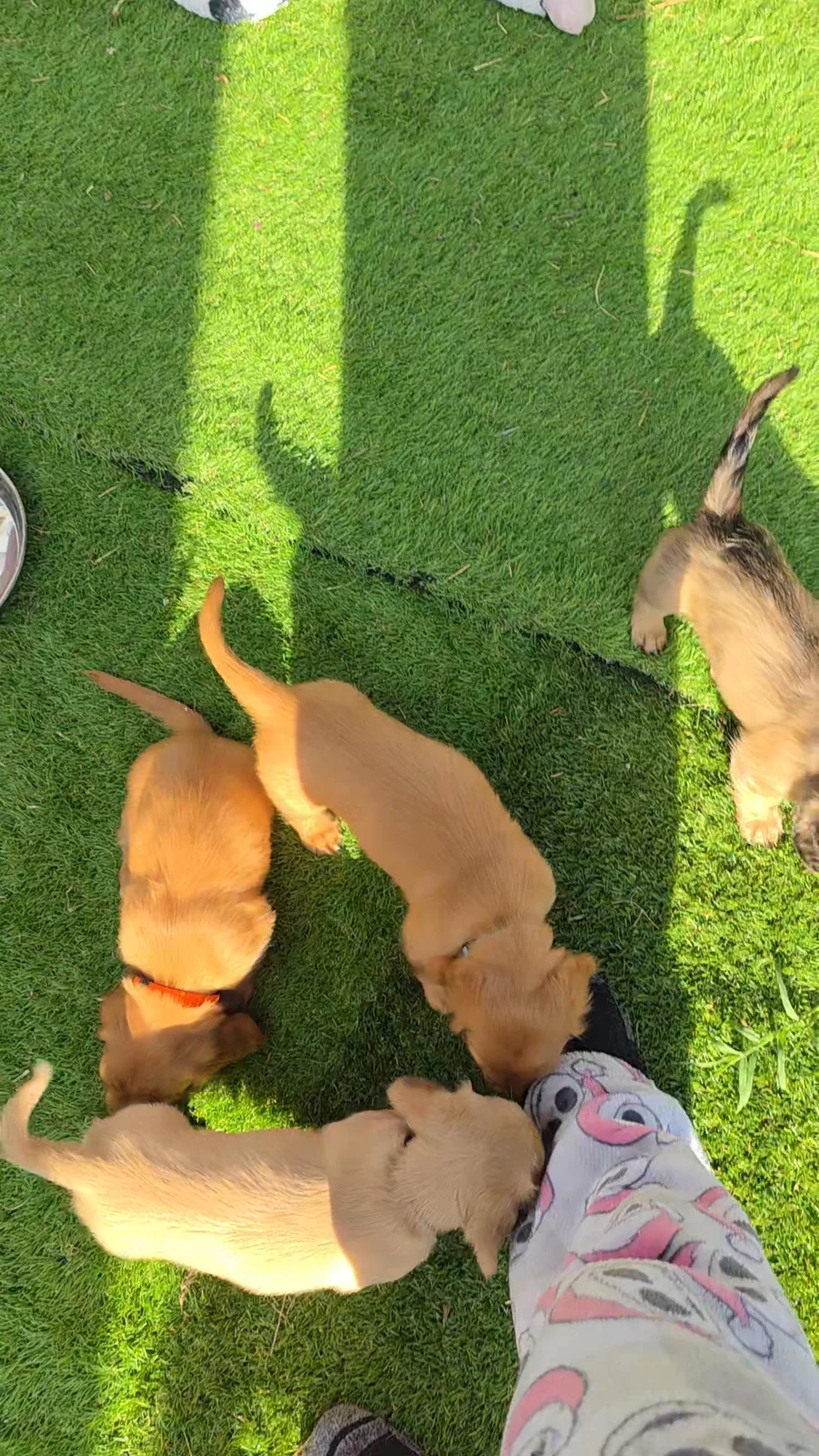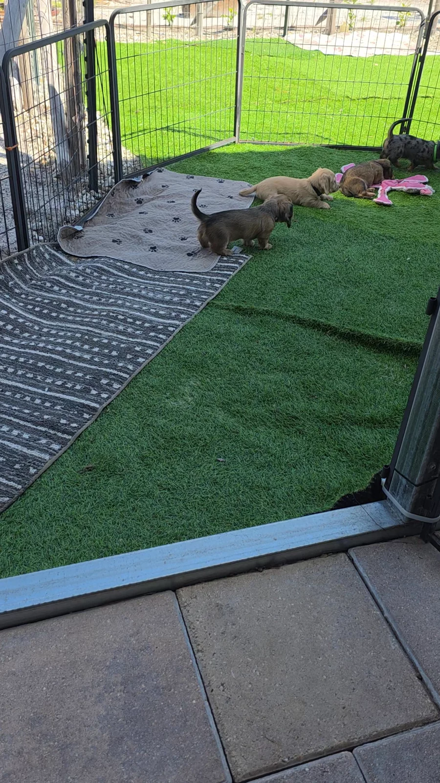 Morning play time . Everyone uses the doggie doors and goes outside in the play area on their own. The grass is turf and they will go outside and potty. Some refuses to stay still for a picture. Miss Tilly and pumpkin especially.