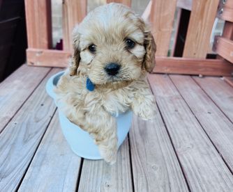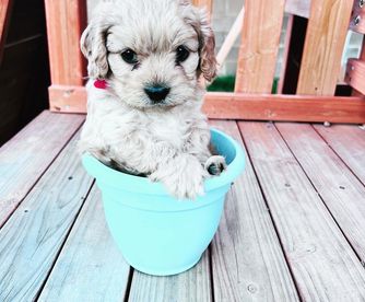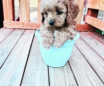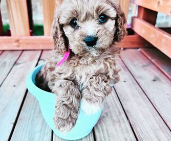 “Bella is a purebred, registered, Cavalier King Charles Spaniel. Bruno is a purebred, registered, Toy Poodle. The puppies have had their first health check, their first set of vaccinations, and deworming. The $500 deposit will go towards the remaining balance.”