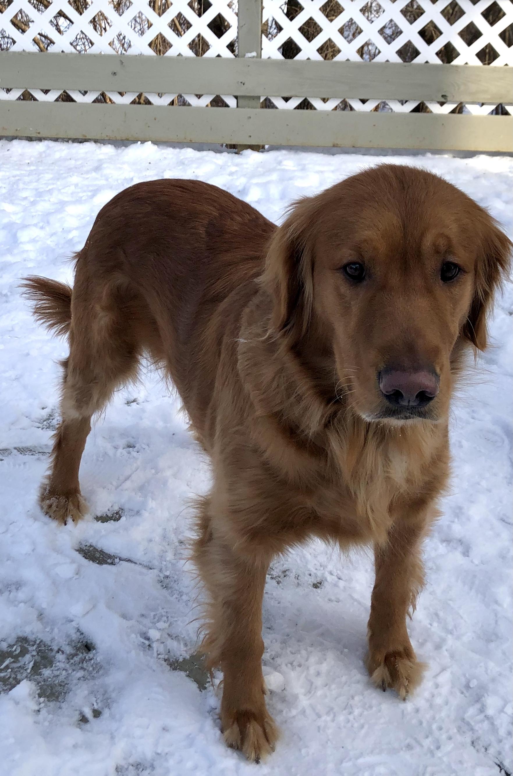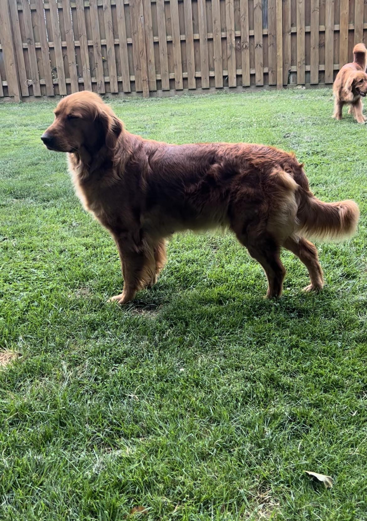 Benly is a sweet tempered boy who draws a crowd wherever we go. He loves people, especially small children and is eager to please. He comes from show lines and has an impressive number of champions and grand champions in his pedigree, including Hillock’s Jack Daniel’s. He is a solid 73 lbs with a nice blocky head and a well balanced body. He is on the darker end of the golden spectrum and has a thick lustrous coat. We are often asked if he just came from the groomer, but a weekly brush out is all he needs to maintain his beautiful coat.