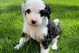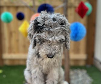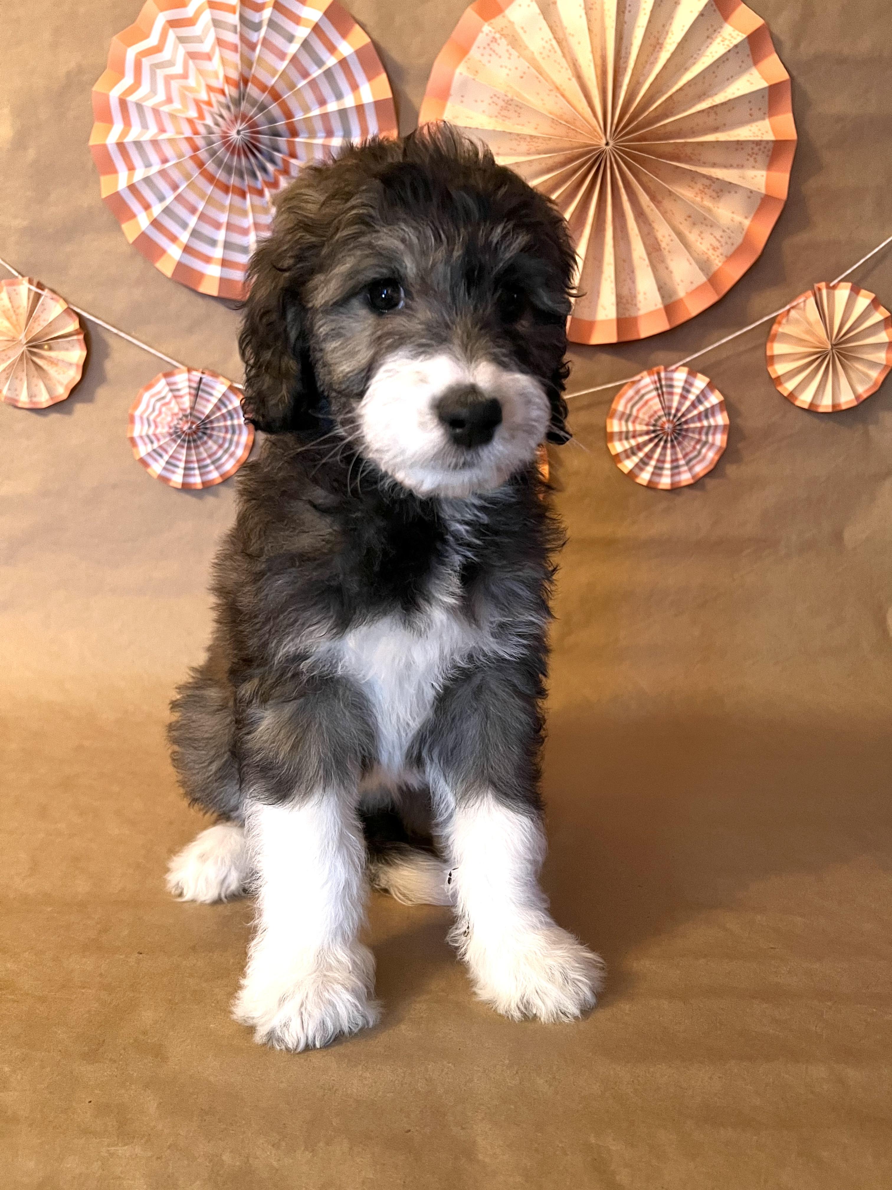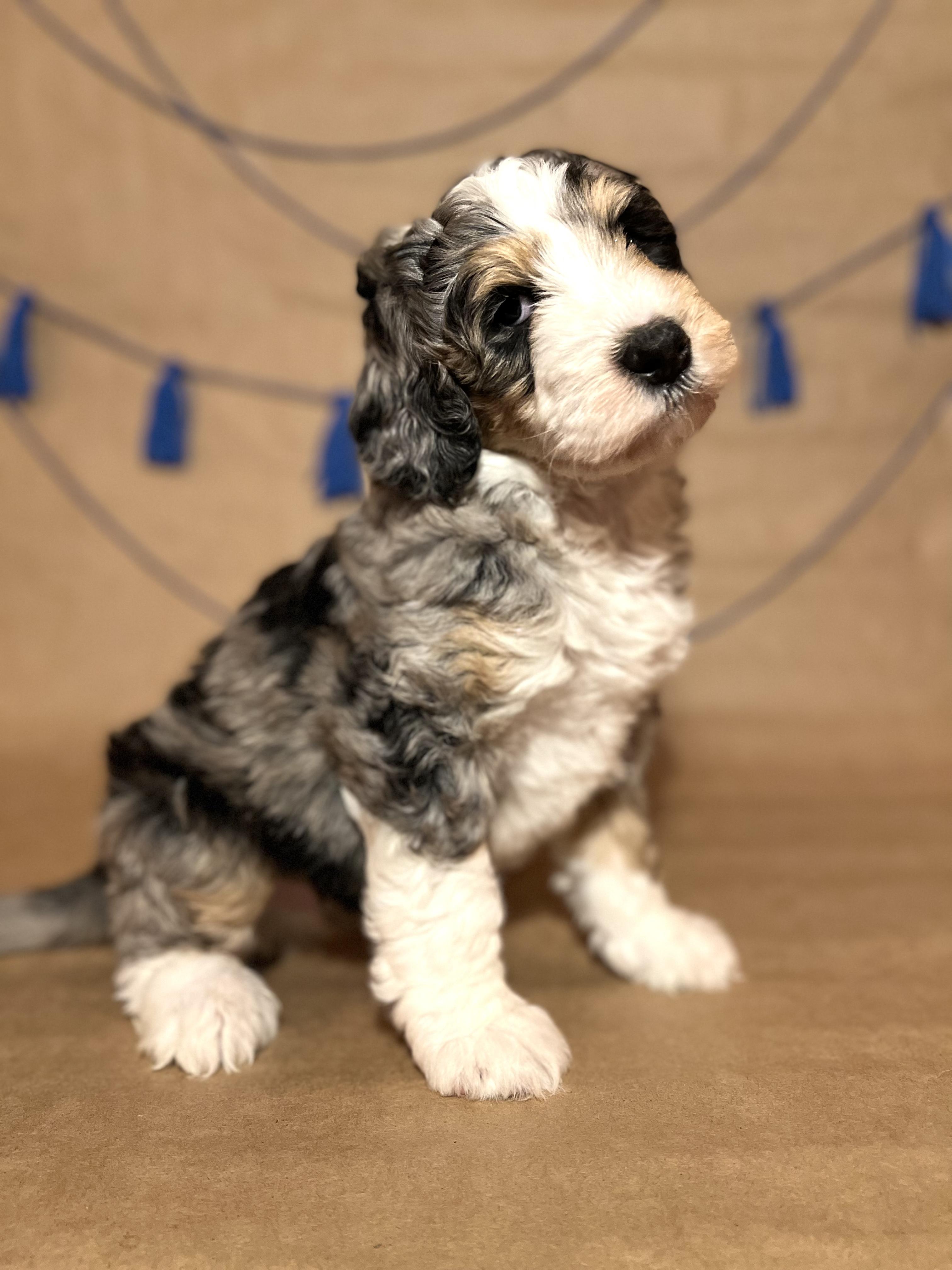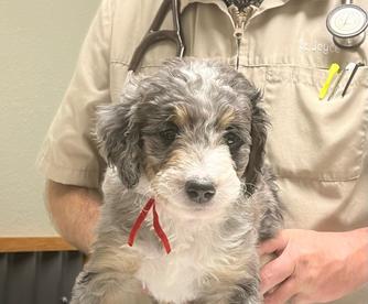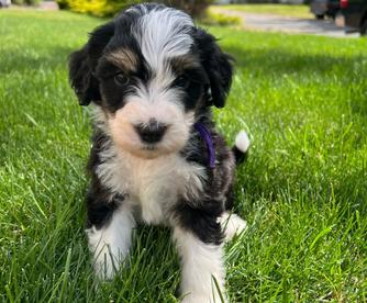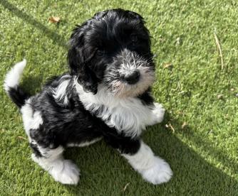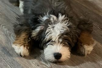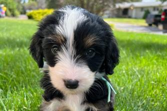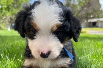 Our Aussiedoodle puppies include blue merle, black phantom, black and white, and black tri-color. Bernedoodle puppies include sable, black, black and white, tri-color, phantom, and merle. Colors will vary depending on the parent dogs.