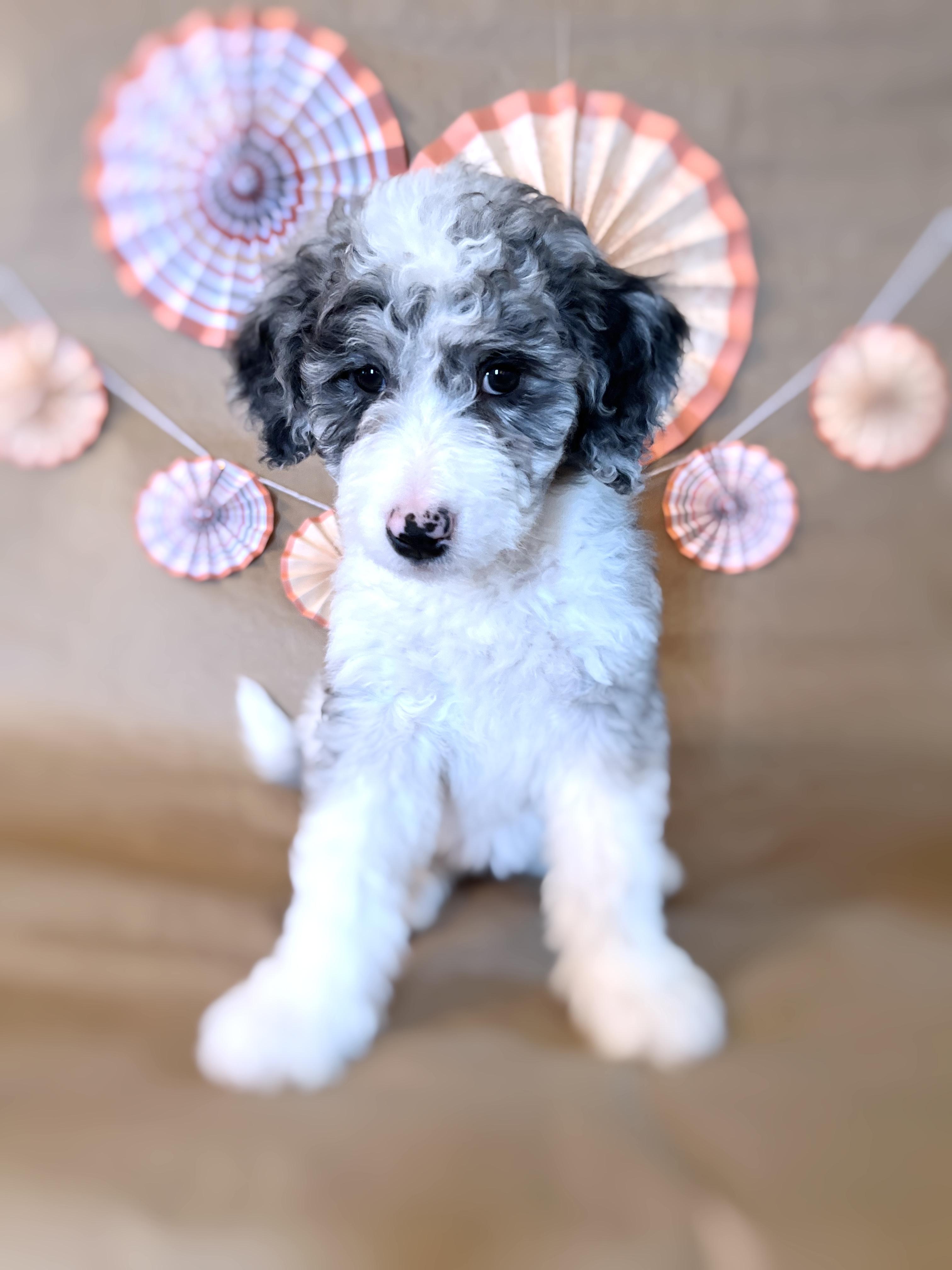 Our Bernedoodle puppies include sable, black, black and white, tri-color, phantom, and merle. Aussiedoodle puppies include blue merle, black phantom, black and white, and black tri-color. Colors will vary depending on the parent dogs.