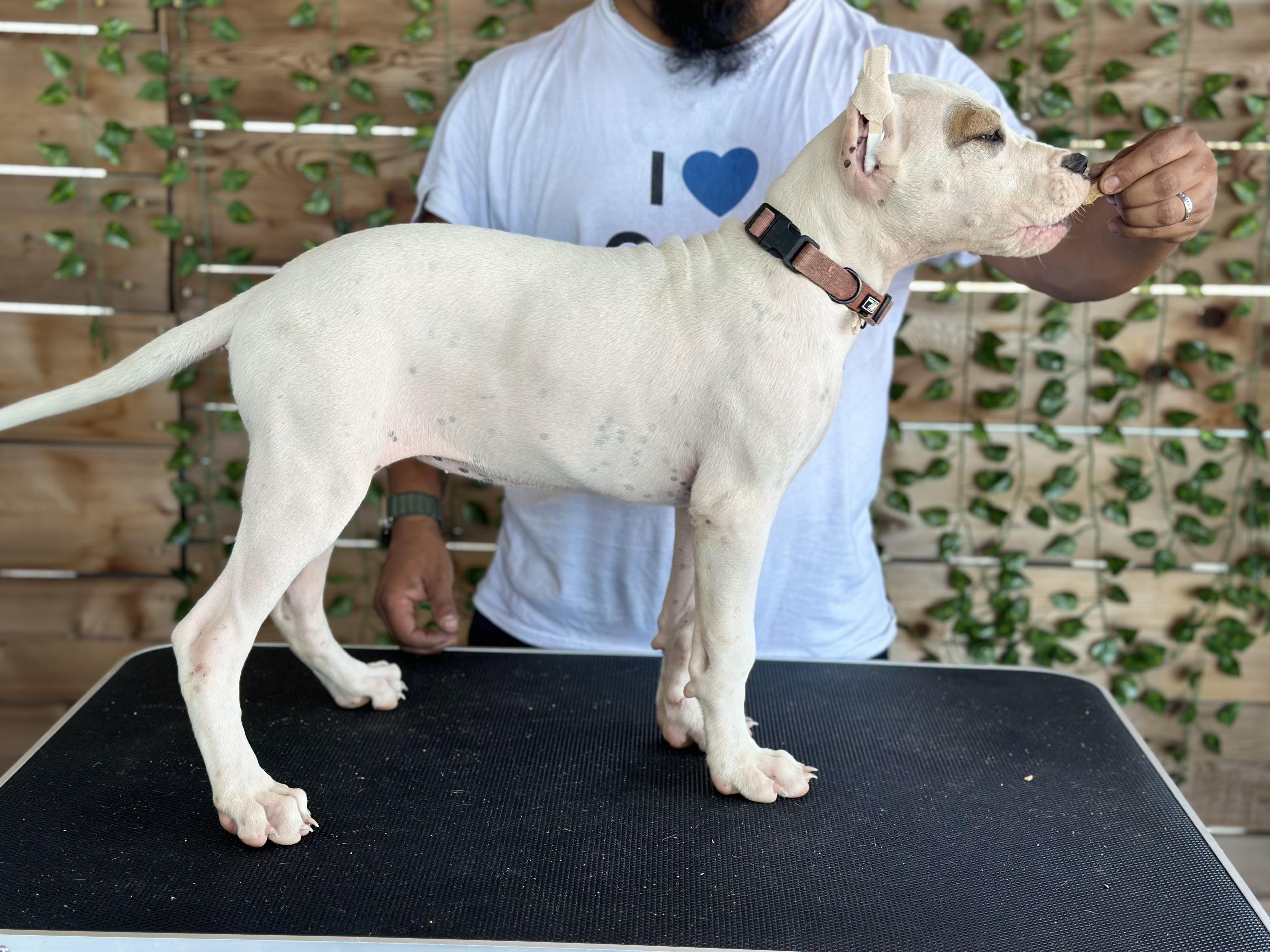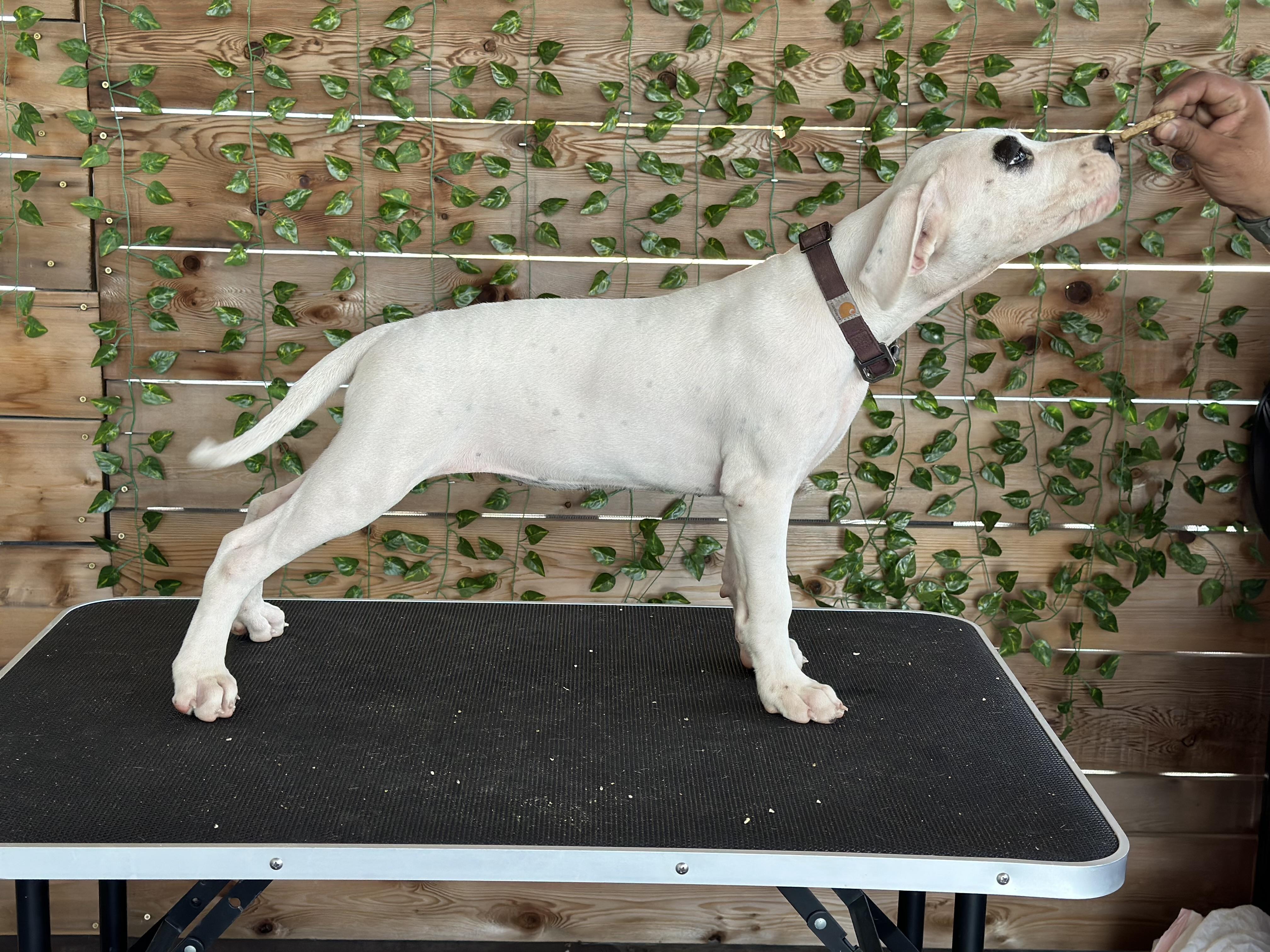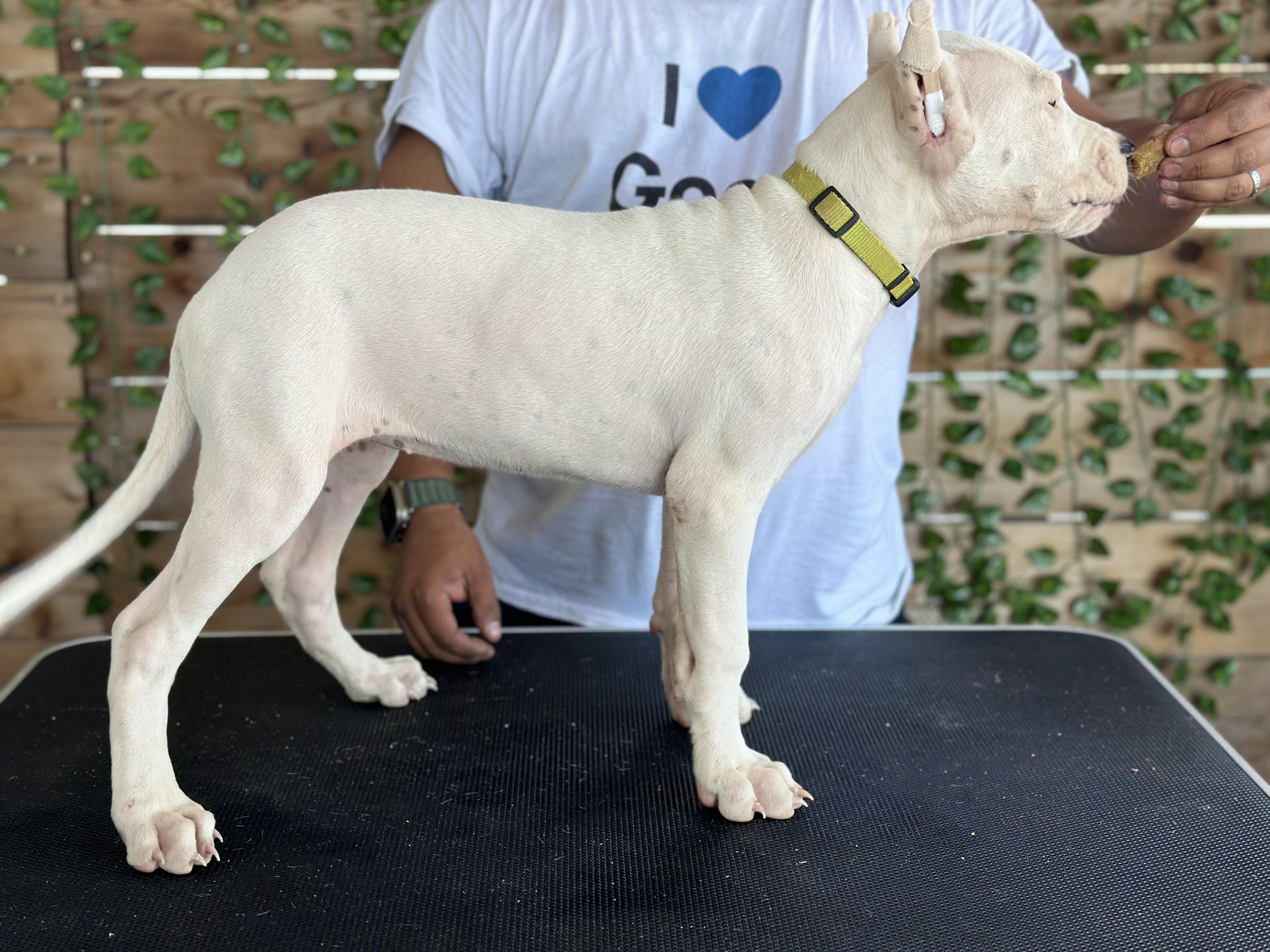 Omega is a female Dogo Argentino almost 7 years old. Carefully selected as a great representative of her breed, Victoria decided to make her part of their program. Victoria has passed Good Dog’s screening process, which involved a review of their breeding practices, environment, and the mental and physical health of their dogs.