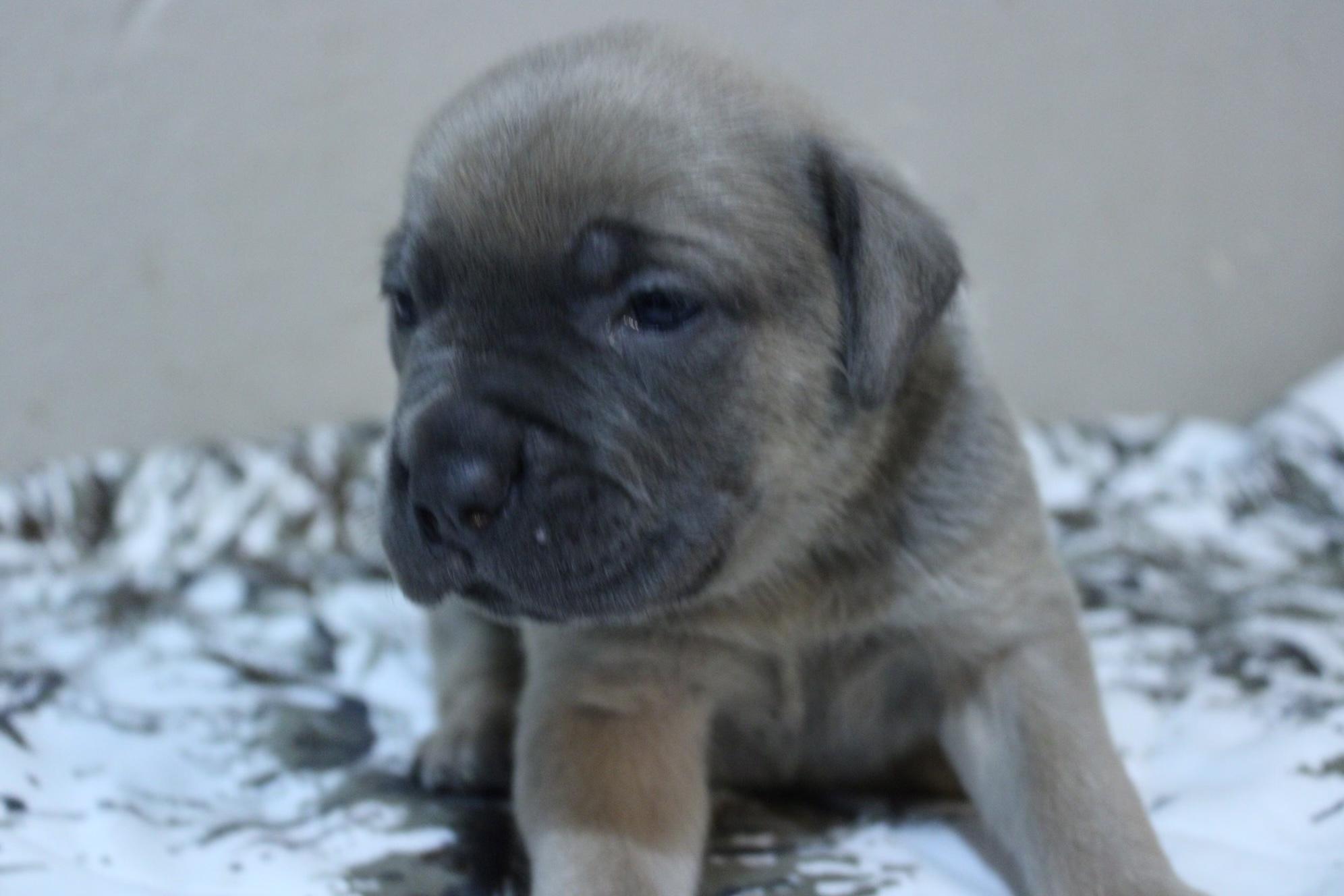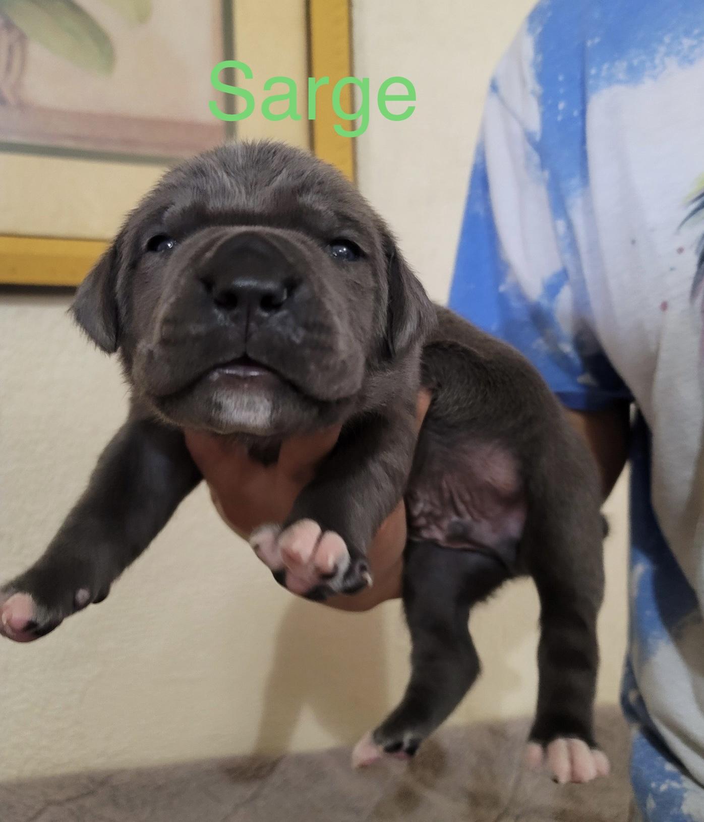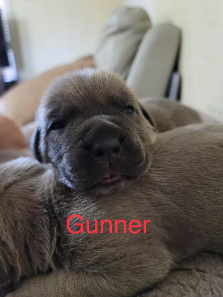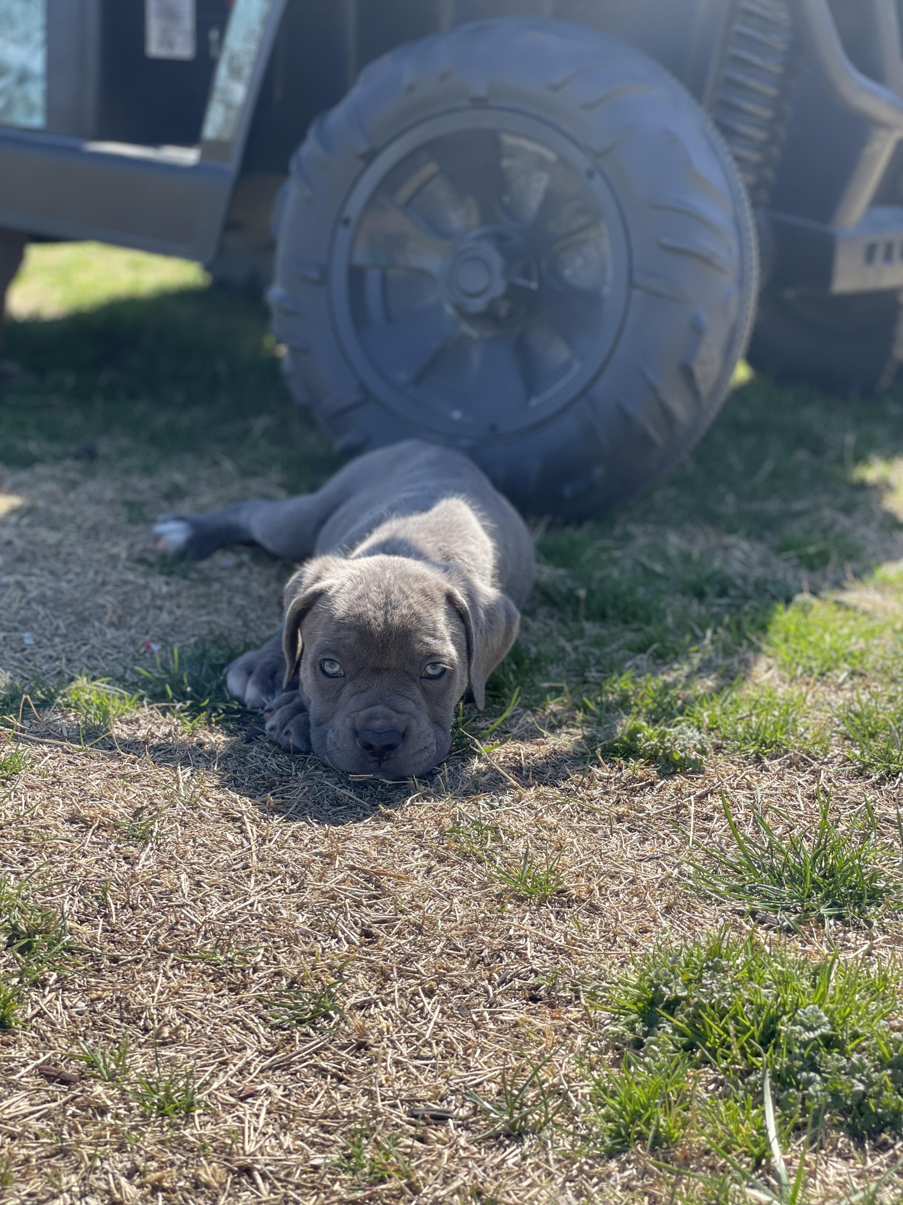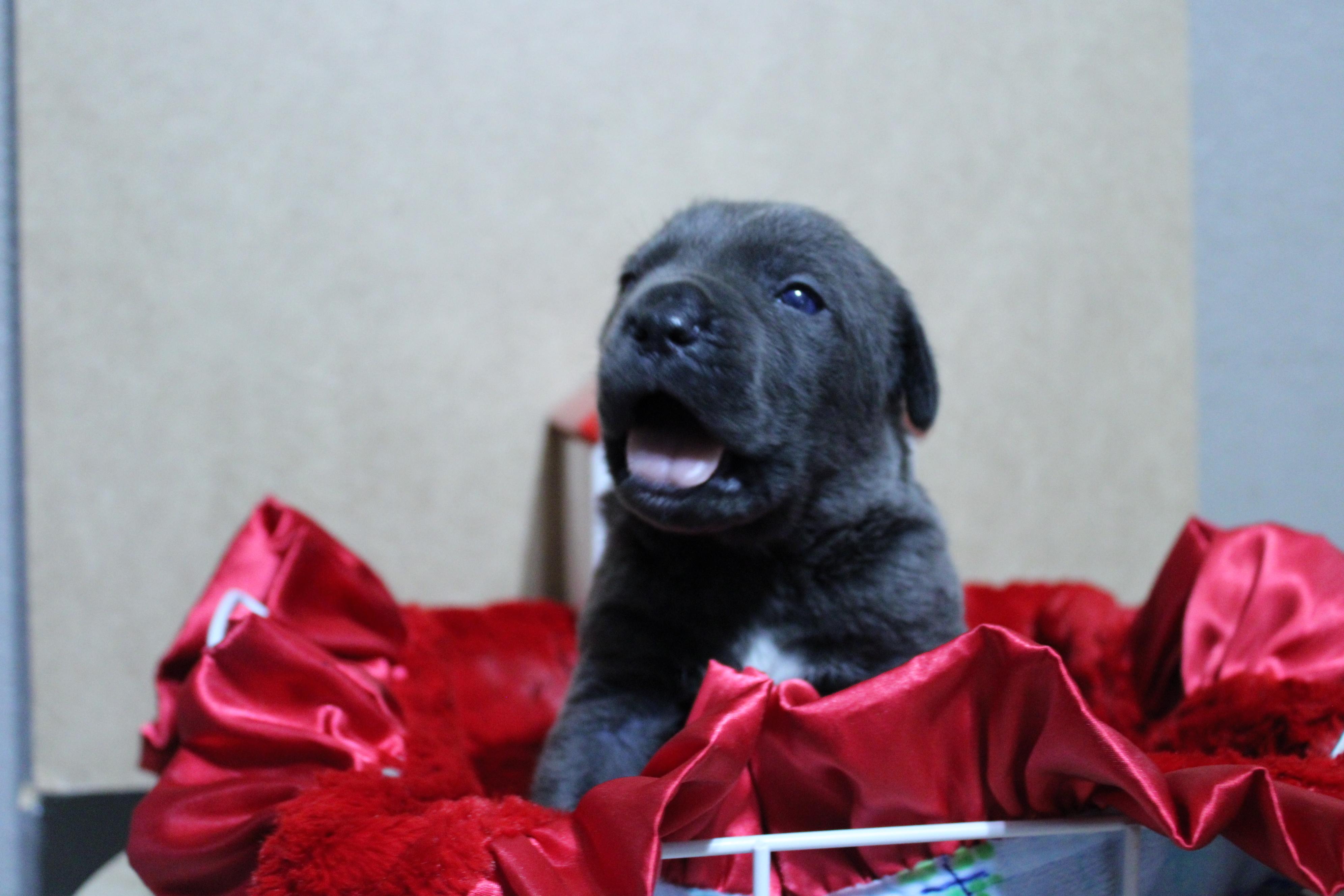 Our Cane Corso puppies include black, black brindle, fawn, gray, gray brindle, and red. Dogo Argentino puppies are white. Colors will vary depending on the parent dogs.
