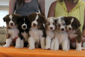 Our puppies include red merle, blue merle, black tri-color, and red tri-color. Colors will vary depending on the parent dogs.