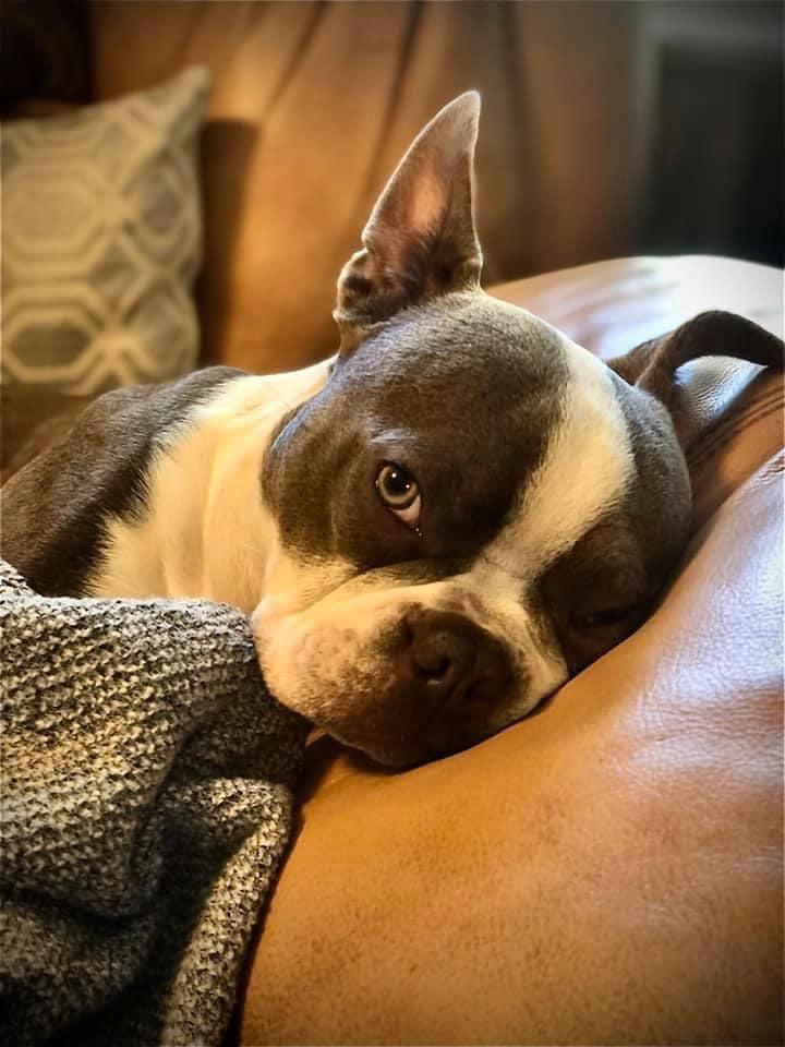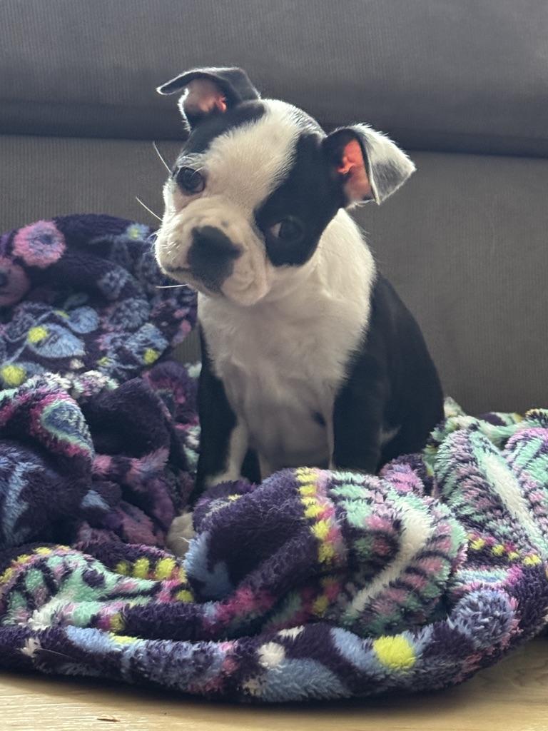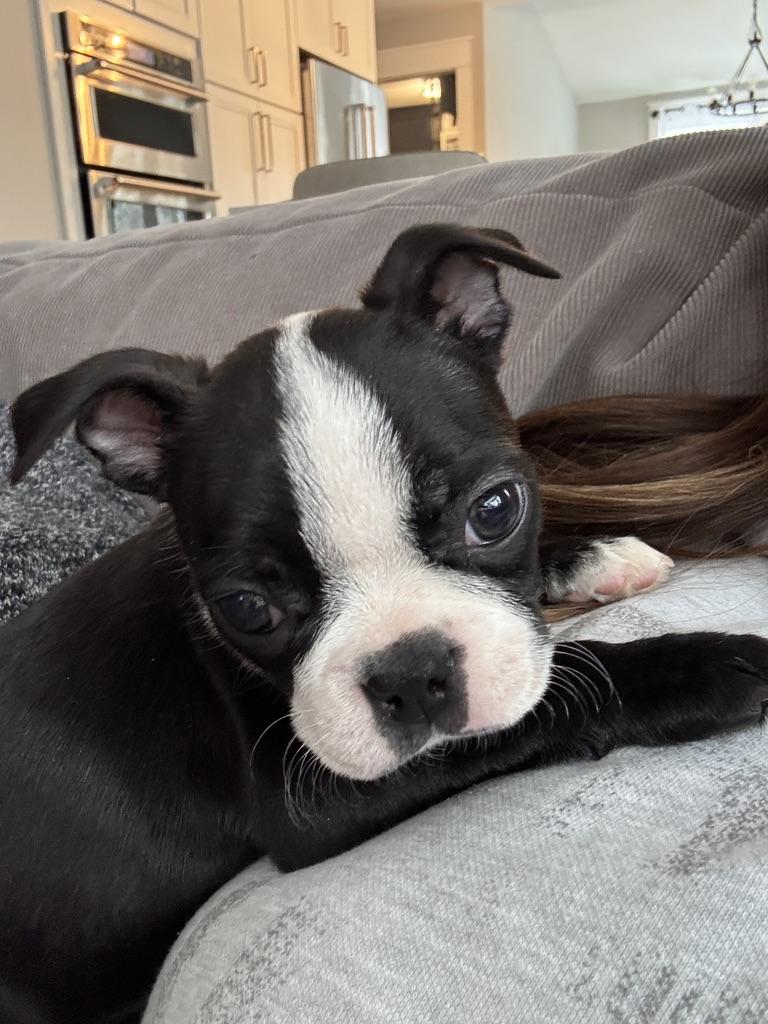 Raven is a beautiful black-and-white Boston Terrier with a heart full of love and a playful spirit. Raven can never get enough snuggles and often finds herself nuzzling up close, especially around my neck when we are watching TV. This dog owns all of my heart.