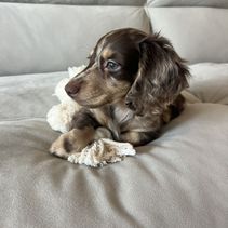 Nova is a female Dachshund. Carefully selected as a great representative of her breed, Kara decided to make her part of their program. Kara has passed Good Dog’s screening process, which involved a review of their breeding practices, environment, and the mental and physical health of their dogs.