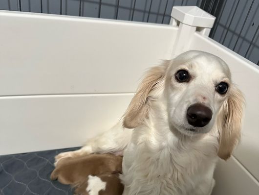 Snowy is a female Dachshund. Carefully selected as a great representative of her breed, Kara decided to make her part of their program. Kara has passed Good Dog’s screening process, which involved a review of their breeding practices, environment, and the mental and physical health of their dogs.