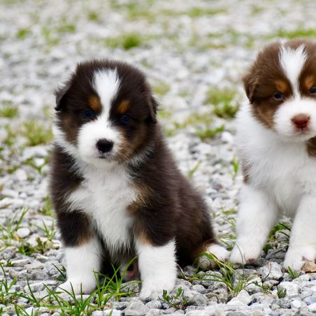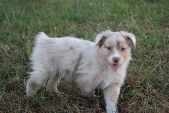 Our Australian Shepherd puppies include black, red merle, blue merle, and red. Soft Coated Wheaten Terrier puppies are wheaten. Colors will vary depending on the parent dogs.
