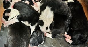 Our Border Collie puppies include black and white, blue merle, and white and red. Bearded Collie puppies include blue and black. Colors will vary depending on the parent dogs.