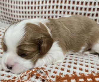Our Bichon Frise puppies are white. Cavalier King Charles Spaniel puppies include blenheim and tri-color. Colors will vary depending on the parent dogs.