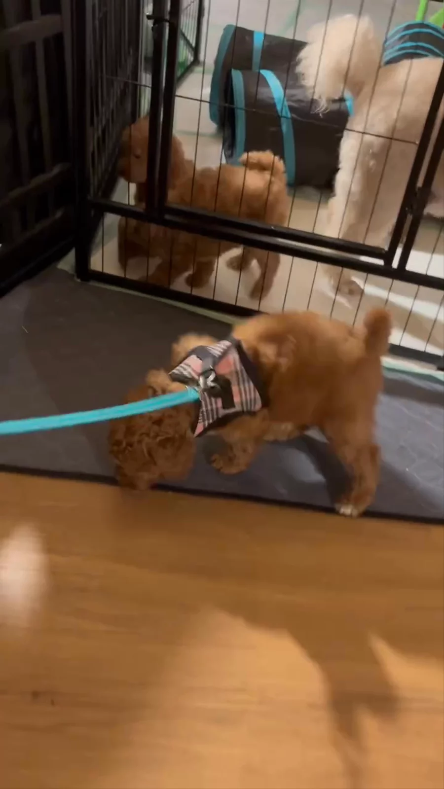 Raury and Quincy’s 7 week old pups are getting comfortable in a harness. Those are some happy tails.
