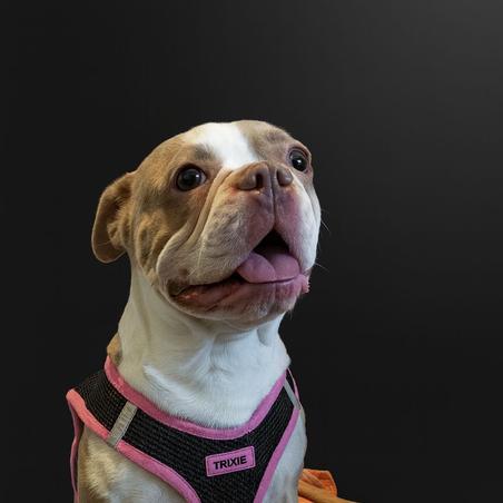 Our BoY Brock is getting used to wearing a harness & they only had his size in PINK 🤷♀️😁, But does he seriously look like he cares 🤣♂️💕