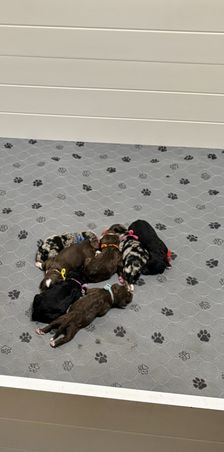 Our puppies start their life in our living room and the cuddles start shortly thereafter. When the puppies ween from their mama they are moved to a specially designed “puppy room” which is an environment designed for cleanliness and play for the puppies. From birth until the time puppies go home they are mentally and physically stimulated and loved on by our entire family.