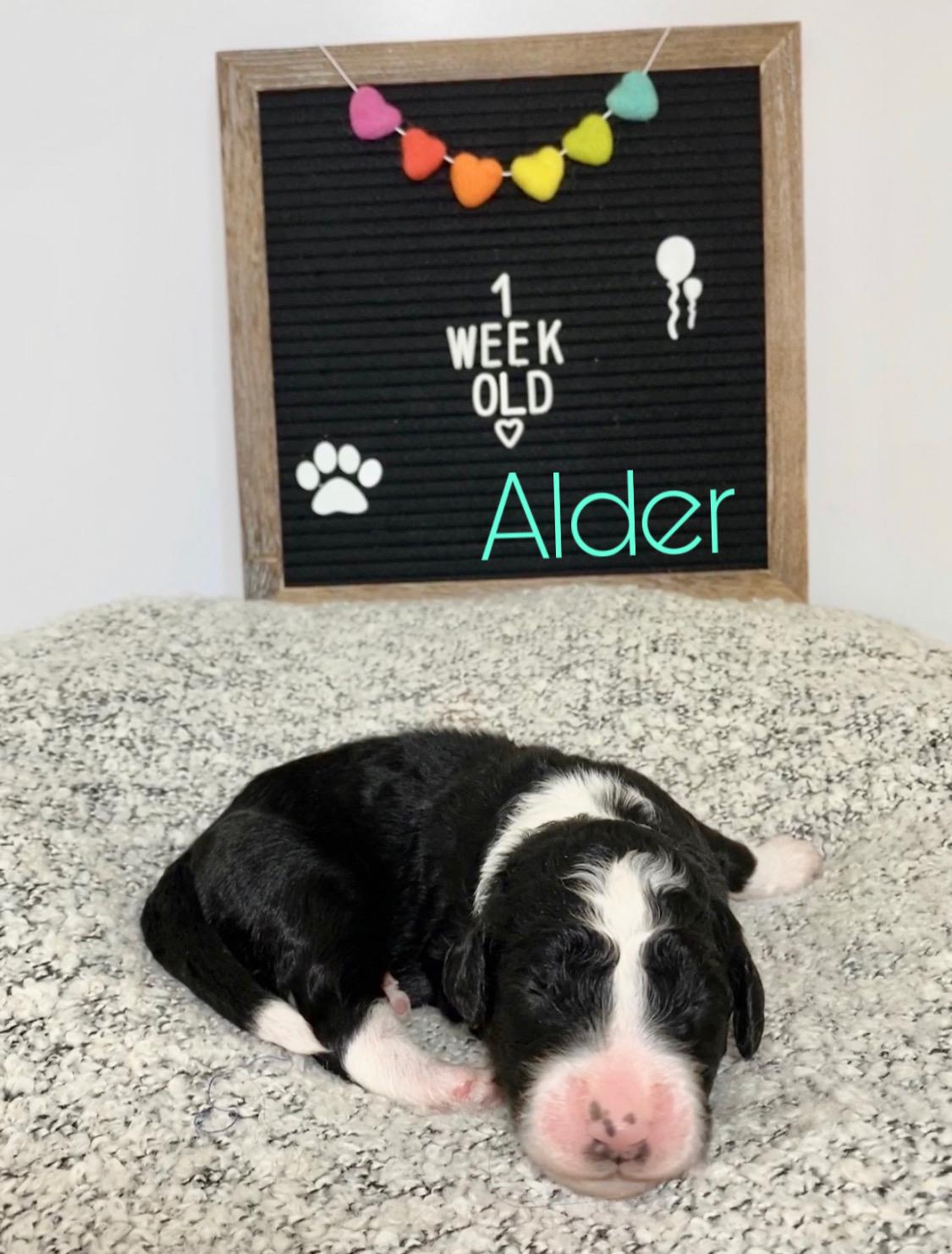 Our Bernedoodle puppies include black and white and tri-color. Colors will vary depending on the parent dogs.