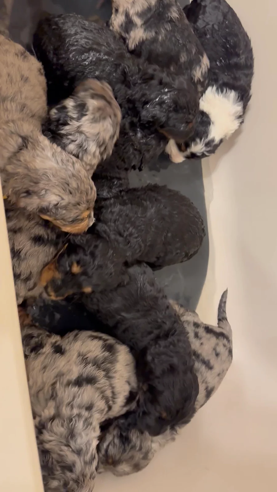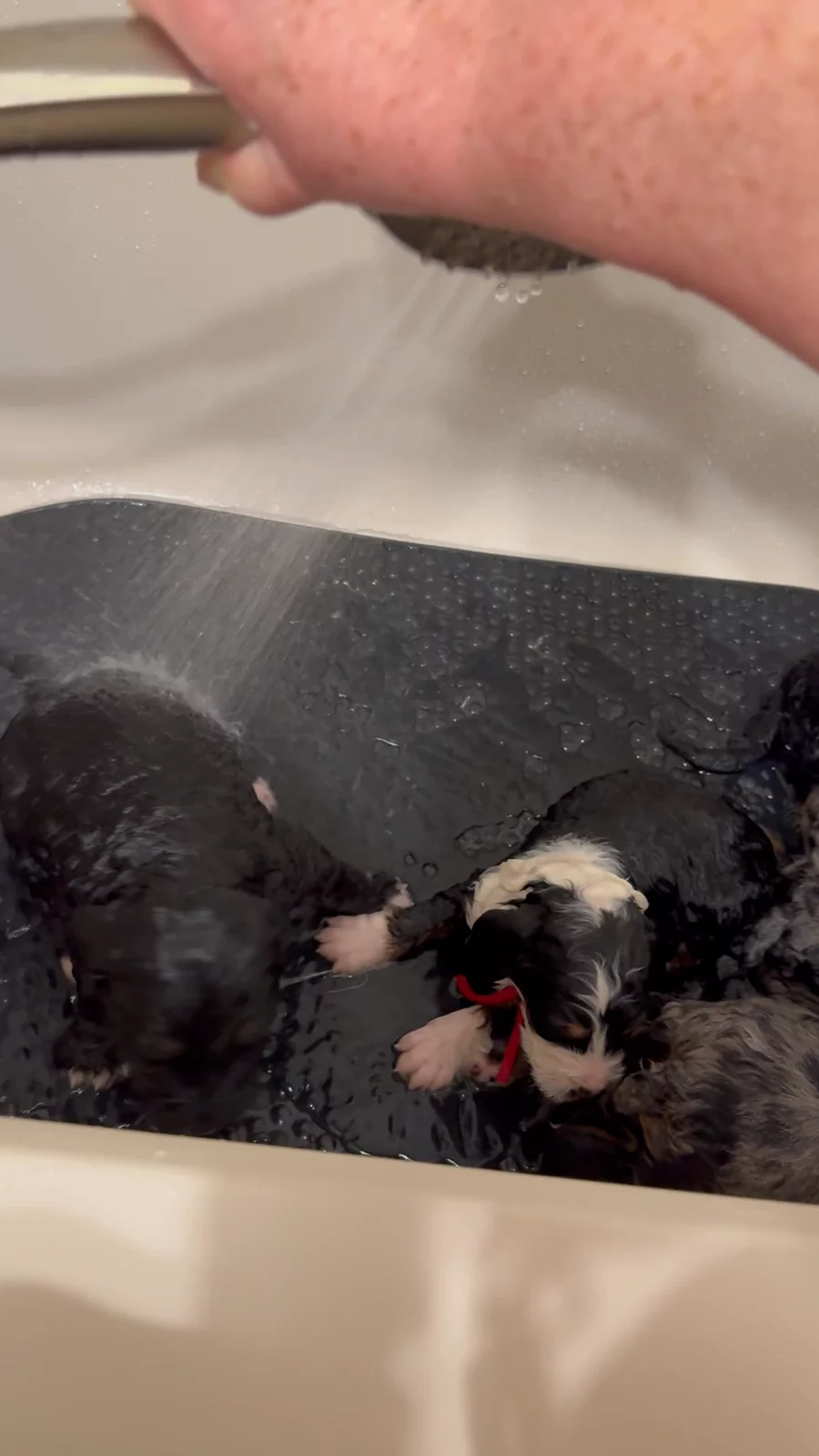 The puppies had their very first bath and gentle rinse today! I like to start them early so bath time is a positive, low-stress experience and something they’ll be comfortable with as adults. Everything was done with their comfort in mind—the bathroom was kept at 95°, the water at a cozy 102°, and the kennel is currently 85°. I’m very careful to avoid spraying their faces and to keep the experience calm and reassuring. They’re now happily demanding some milk from Mom, although Elvira would prefer they settle down just a bit first before nursing. 💕🐾