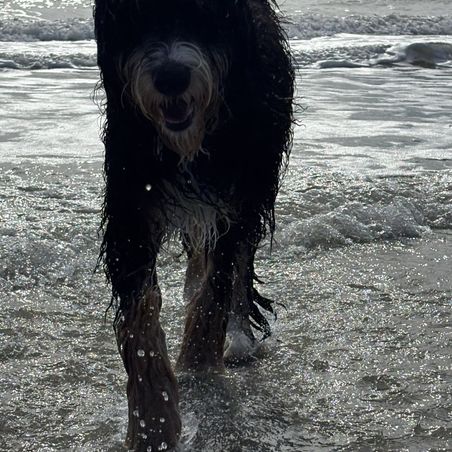 This is beautiful Daisy at seven months old enjoying her first trip to the beach. This girl is a full sister to Elvira and Moose’s litter that is due this weekend.