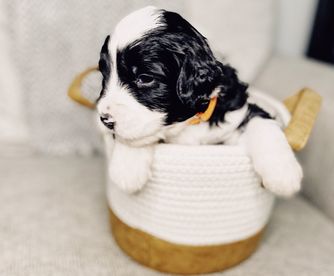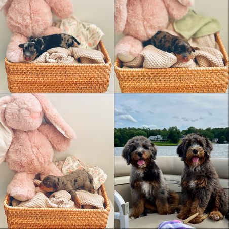 Our Bernedoodle puppies include mini and medium sizes. Assorted Doodle Crosses puppies are miniature size. Sizes will vary depending on the parent dogs.