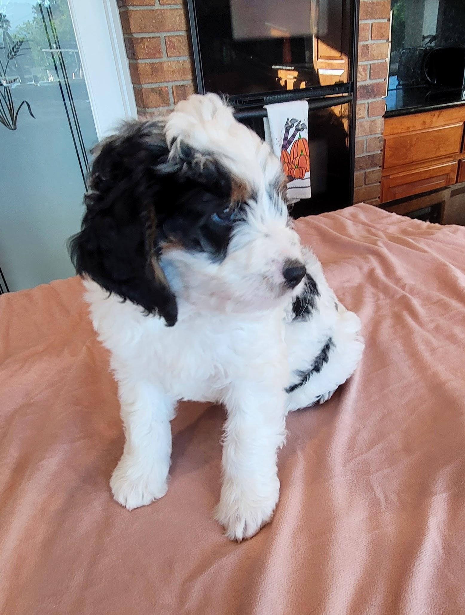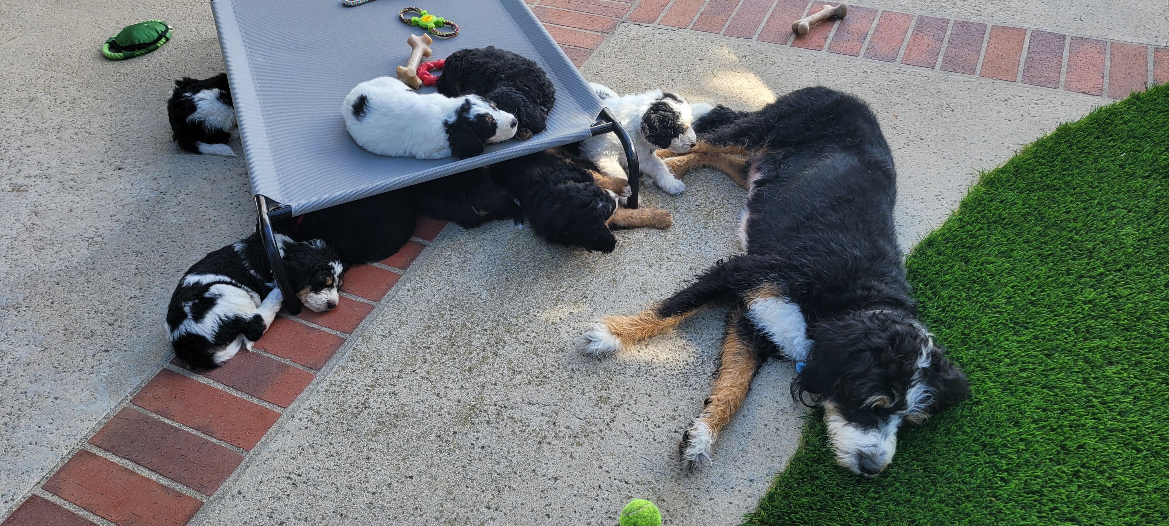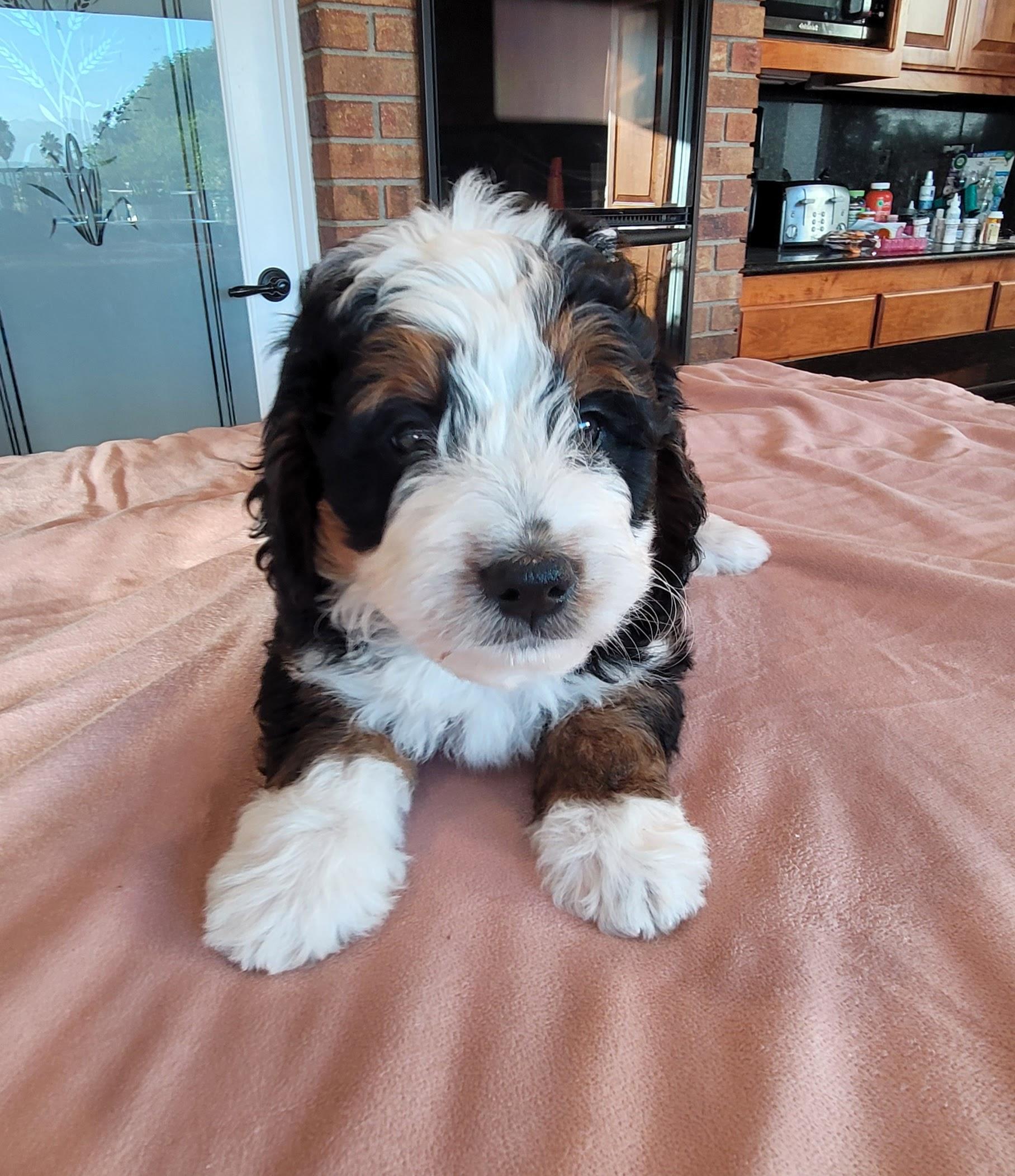 I got lucky and the first "stud" person I spoke with said, "hey wait, there's a lot more to this", and boy were they right. Faith went thru health and genetic testing to make sure she would have healthy pups. Then there was a lot of genetic training to pair her with the perfect mate to make beautiful tri-color bernedoodles.