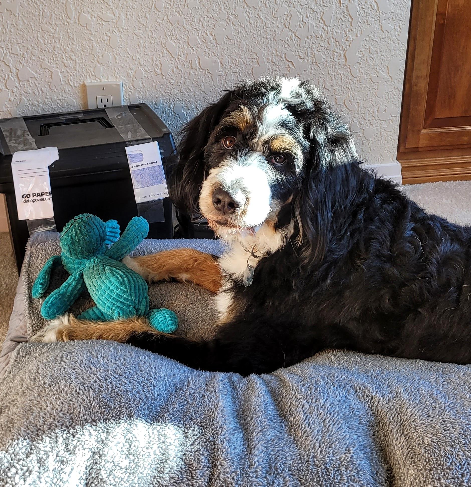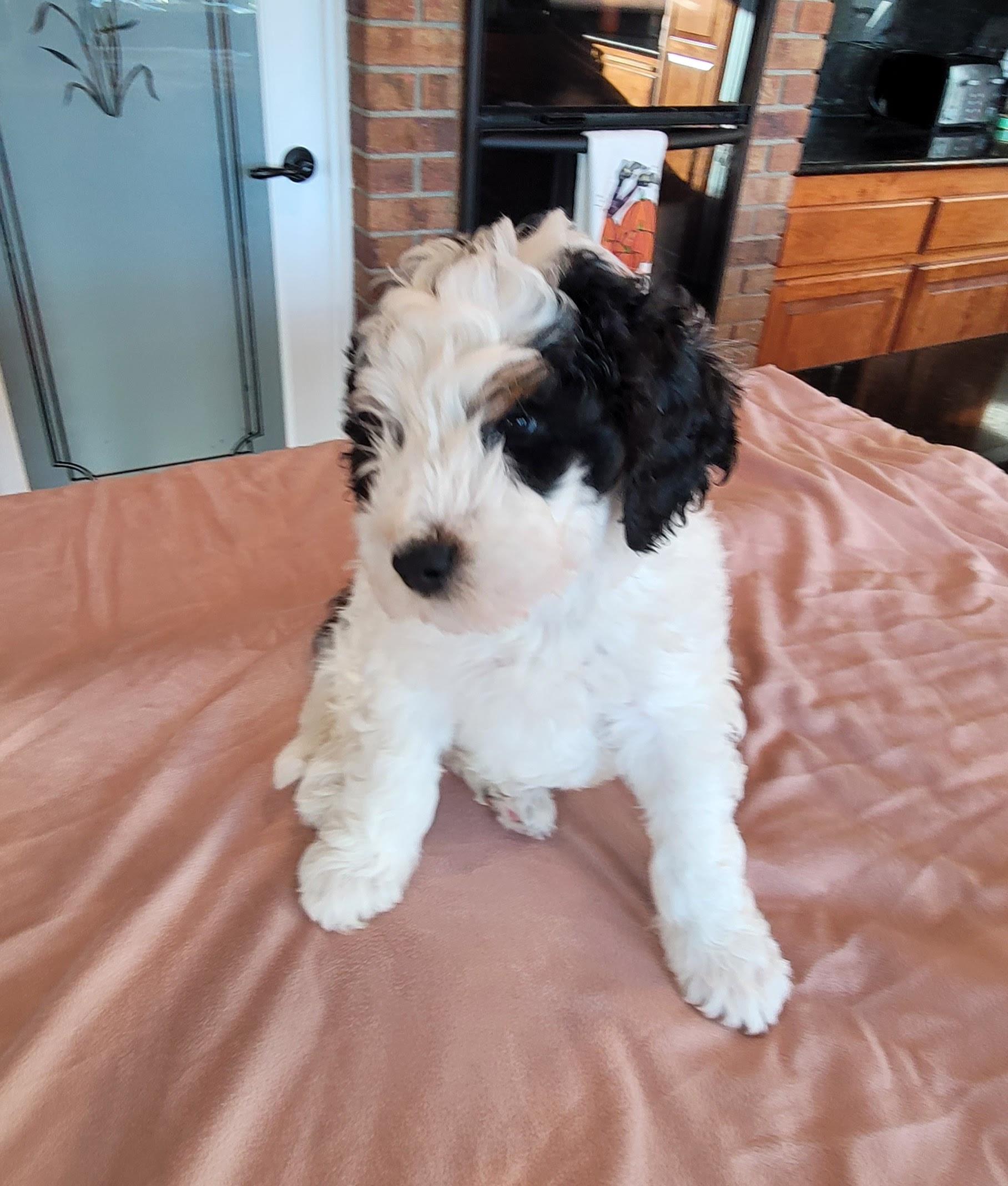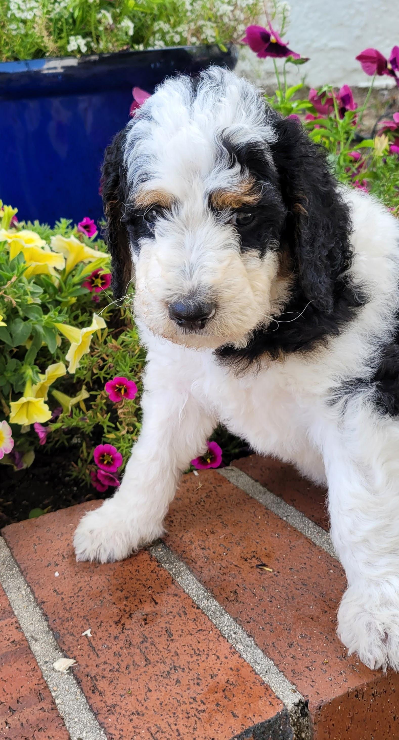I got lucky and the first "stud" person I spoke with said, "hey wait, there's a lot more to this", and boy were they right. Faith went thru health and genetic testing to make sure she would have healthy pups. Then there was a lot of genetic training to pair her with the perfect mate to make beautiful tri-color bernedoodles.