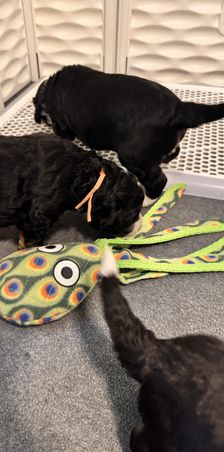 Puppies are 3 weeks old today and their whelping pen looks different. No more pig rails and we have added in their potty areas. Today’s a big day we start daily exposures with novelty items in the whelping pen, new daily sound exposures, as well as our daily handling exercises with them.