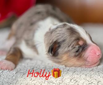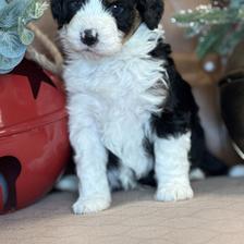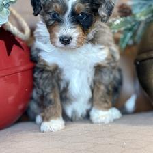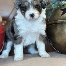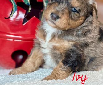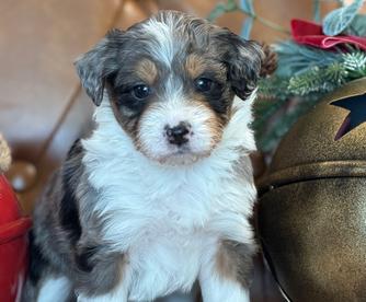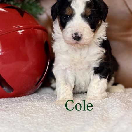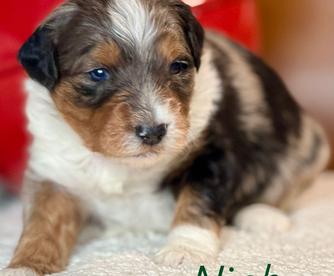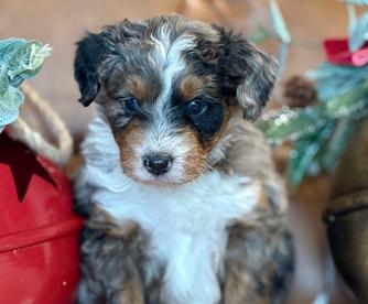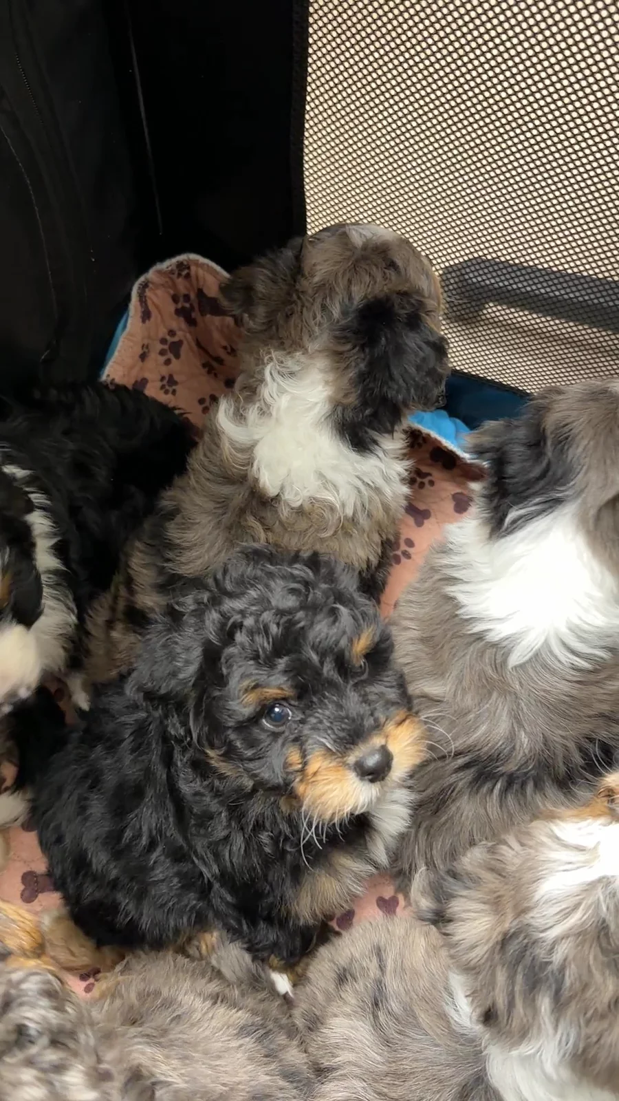 Our Bernedoodle puppies are tri-color. Aussiedoodle puppies are blue merle. Colors will vary depending on the parent dogs.