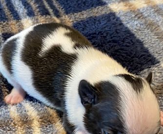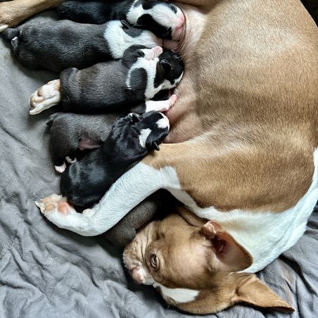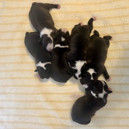 Our puppies include seal brindle and white, brindle and white, seal and white, black brindle and white, and black and white. Colors will vary depending on the parent dogs.