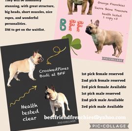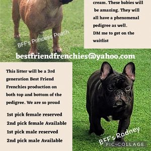 I'm Brenda S., the breeder behind Best Friend Frenchies, LLC located in Polk City, FL. We take pride in breeding healthy and happy dogs. Health and temperament are our number one priority. All our dogs are family. The puppies are born and raised in our home. We love them all here first and do what we can to make their transition as unstressed as possible. We focus on health, temperament, and structure. We health test all of our breeding dogs and have started with OFA testing as well.