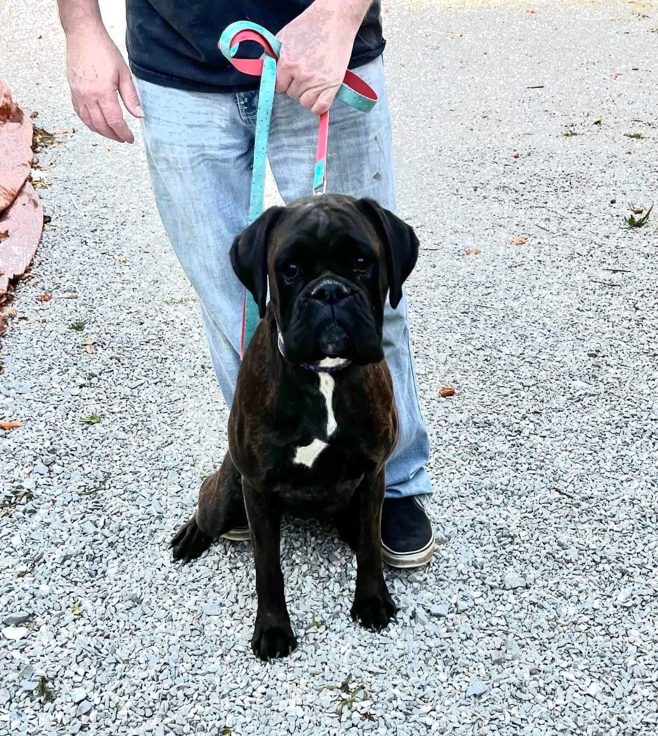 Pearl is a female Boxer. Carefully selected as a great representative of her breed, Heidi decided to make her part of their program. Heidi has passed Good Dog’s screening process, which involved a review of their breeding practices, environment, and the mental and physical health of their dogs.