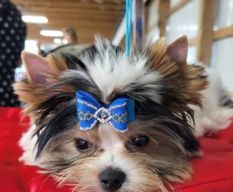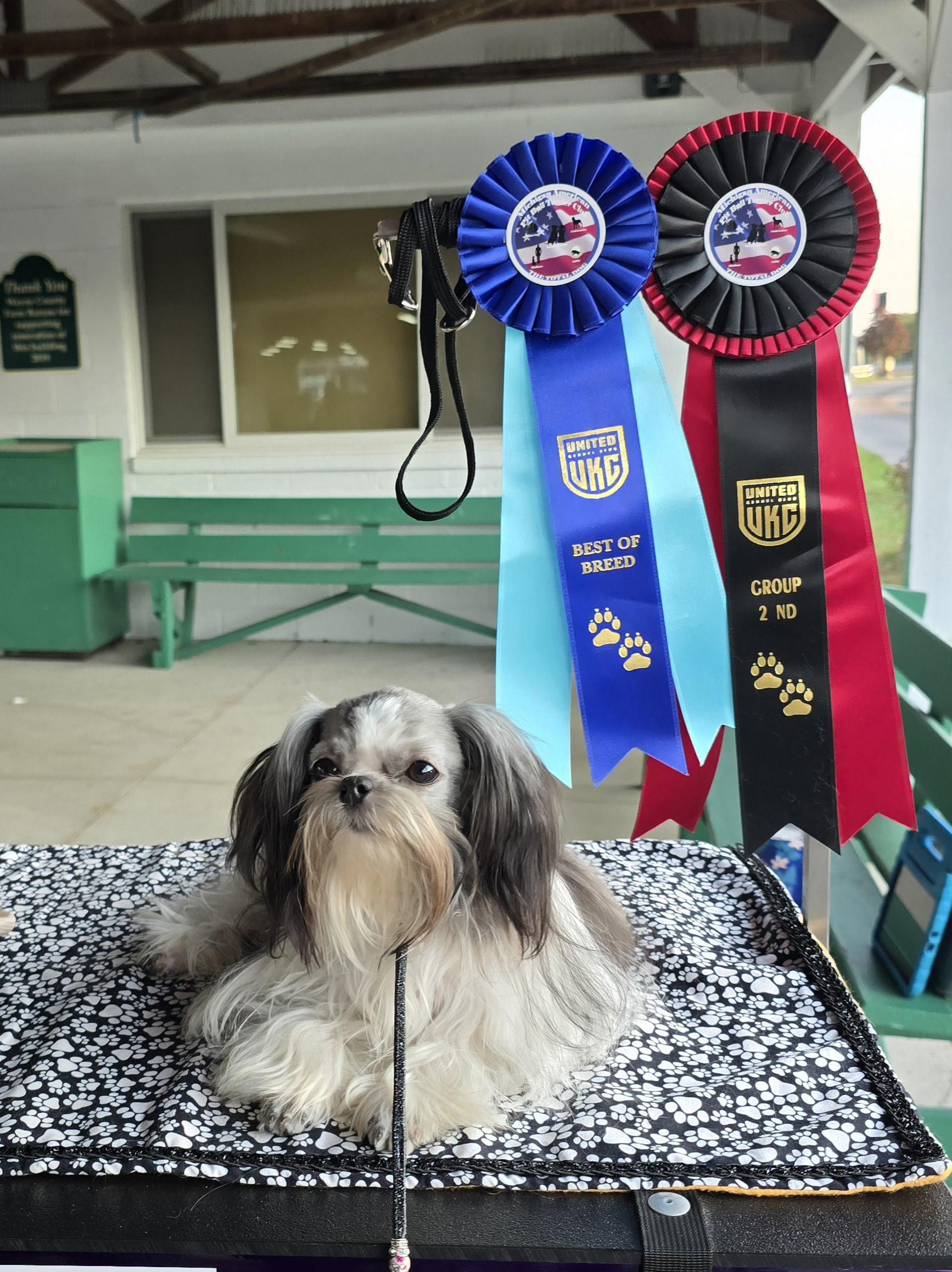 Onna is a beautiful rare blue and white long coat. She's been showing since she was a puppy and is now a Grand Champion. Onna became the number 1 Mi Ki in the Country in 2023. This is her 1st litter so she was only shown for a short time in 2024 but still took the number 5 spot which we are very proud of. Onna is a wonderfully sweet and affectionate girl and when she was showing, she knew she was the best dog in the ring and she really strutted her stuff! We are so blessed to have this beautiful girl in our show and breeding program.