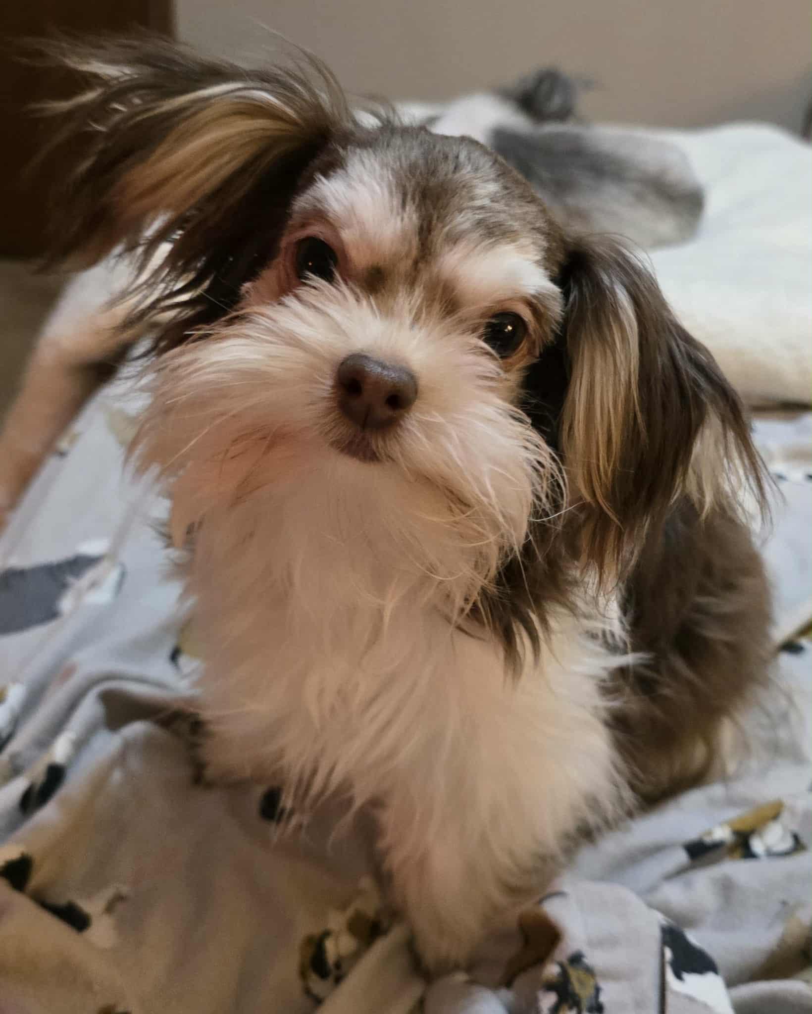 Abby is a dainty little girl. She's just as sweet as she can be. She's called a Smooth Face Mi Ki. The difference is there is no facial furnishings and the coat on the body and legs does not get as long as with the long coat Mi Kis. People like them because they have an easier coat to maintain, and they are very cute.