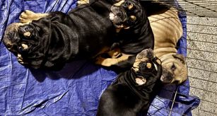 Bugsy is a gorgeous boy with a unique coat, a Red tri-color sable. Both his coat and wrinkles are virtually perfect in their symmetry. He’s big but has been lean his whole life. At 10 1/2 years young he’s had no serious health issues and still will run around and play. His temperment is both calm and loving. He’s never been in a serious fight and loves seemingly everyone (even cats and toddlers!). He is exceptionally intelligent. It was his combo of looks and intelligence that finally pushed me to try my hand at breeding. (He has been studded out before though)
