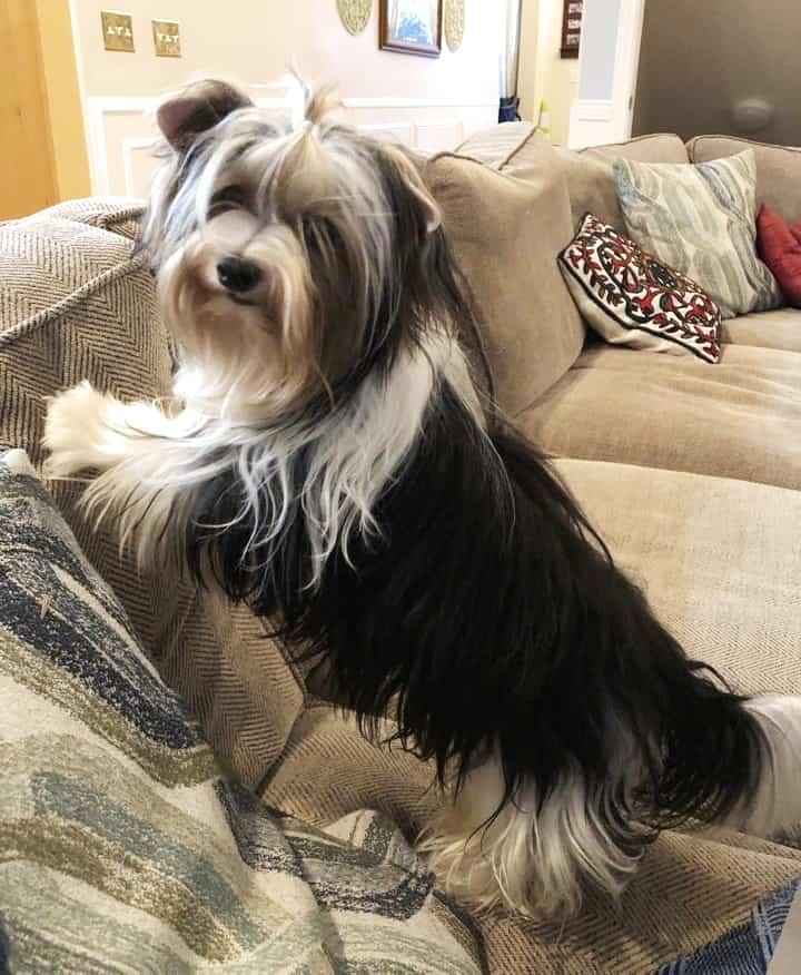 Hootie is a European Biewer Terrier with AKC registration. He has a distinctive black patch on his back and a light face accented with tan markings. His eager-to-please nature makes him exceptionally easy to train. Playful and full of energy, he's always up for an adventure, yet he knows how to settle down and shower you with affection. He is loved very much by our family. Hooties coloring was originally black, however within the first and second year it started to fade to blue...this is common and considered breed standard.