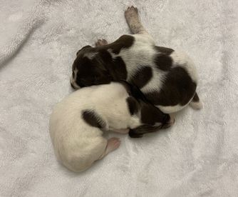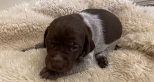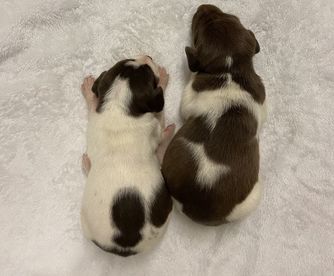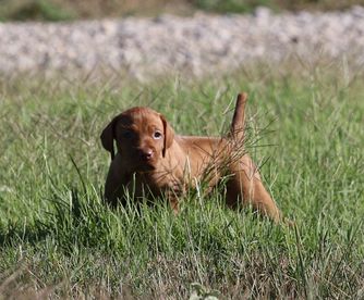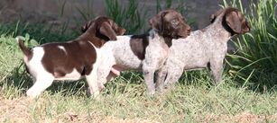 Our German Shorthaired Pointer puppies include liver and white and liver roan. Vizsla puppies are golden rust. Colors will vary depending on the parent dogs.