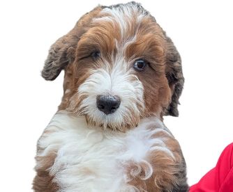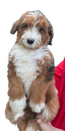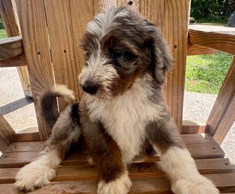 Our Aussiedoodle puppies include brown and white, apricot, blue merle, and red merle. Bernedoodle puppies include chocolate merle, brown and white, black and white, and blue merle. Colors will vary depending on the parent dogs.