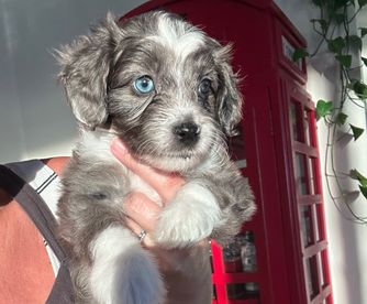Miniature Australian Shepherd puppies include tiny and miniature sizes. Aussiedoodle puppies include toy, mini, and standard sizes. Sizes will vary depending on the parent dogs.