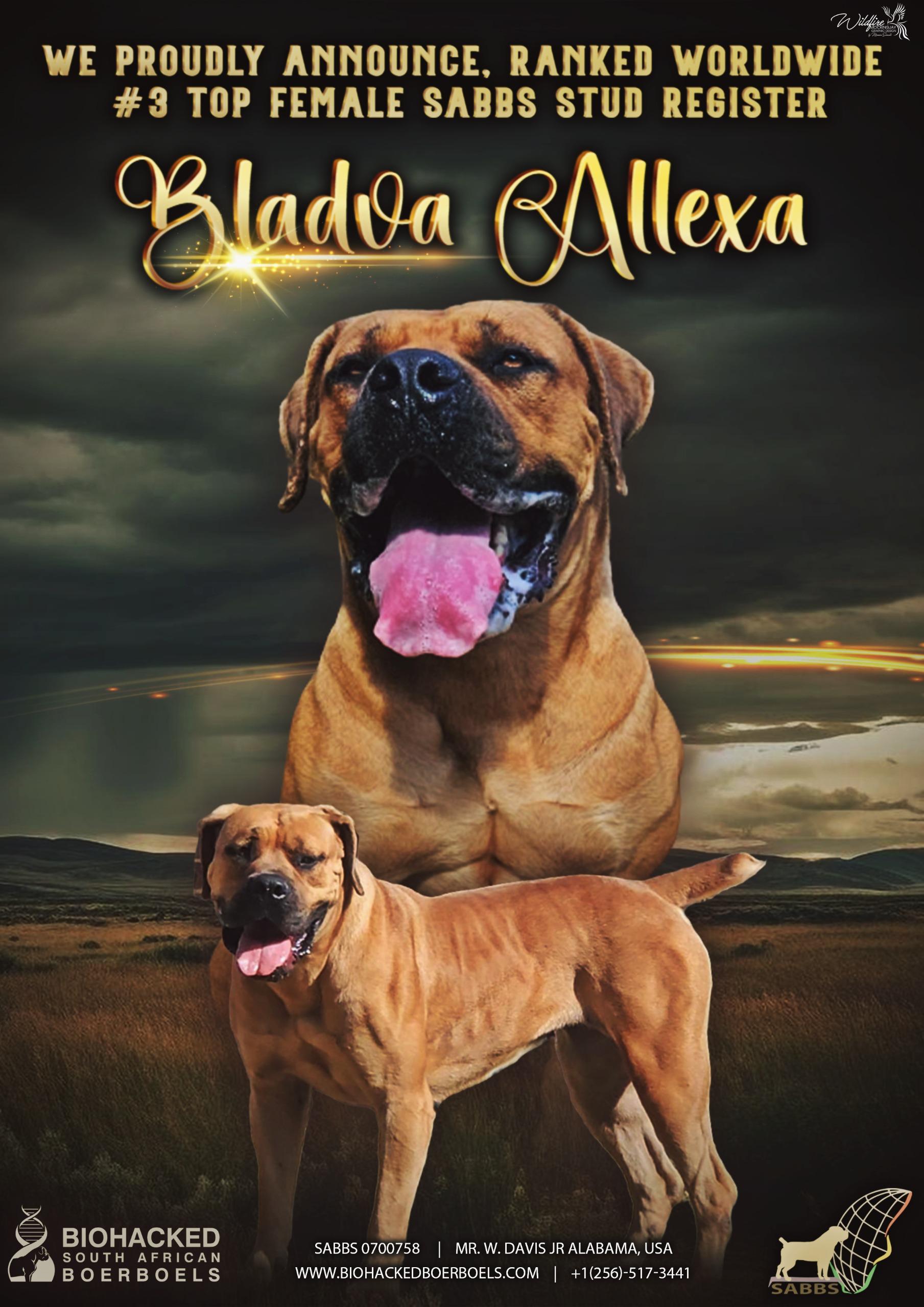 Bladva Allexa is a top-ranked Boerboel female, and she is currently ranked number three out of 100 females on the ACTIVE STUD REGISTER FEMALES. She is a valuable asset to the Biohacked Boerboels breeding program.