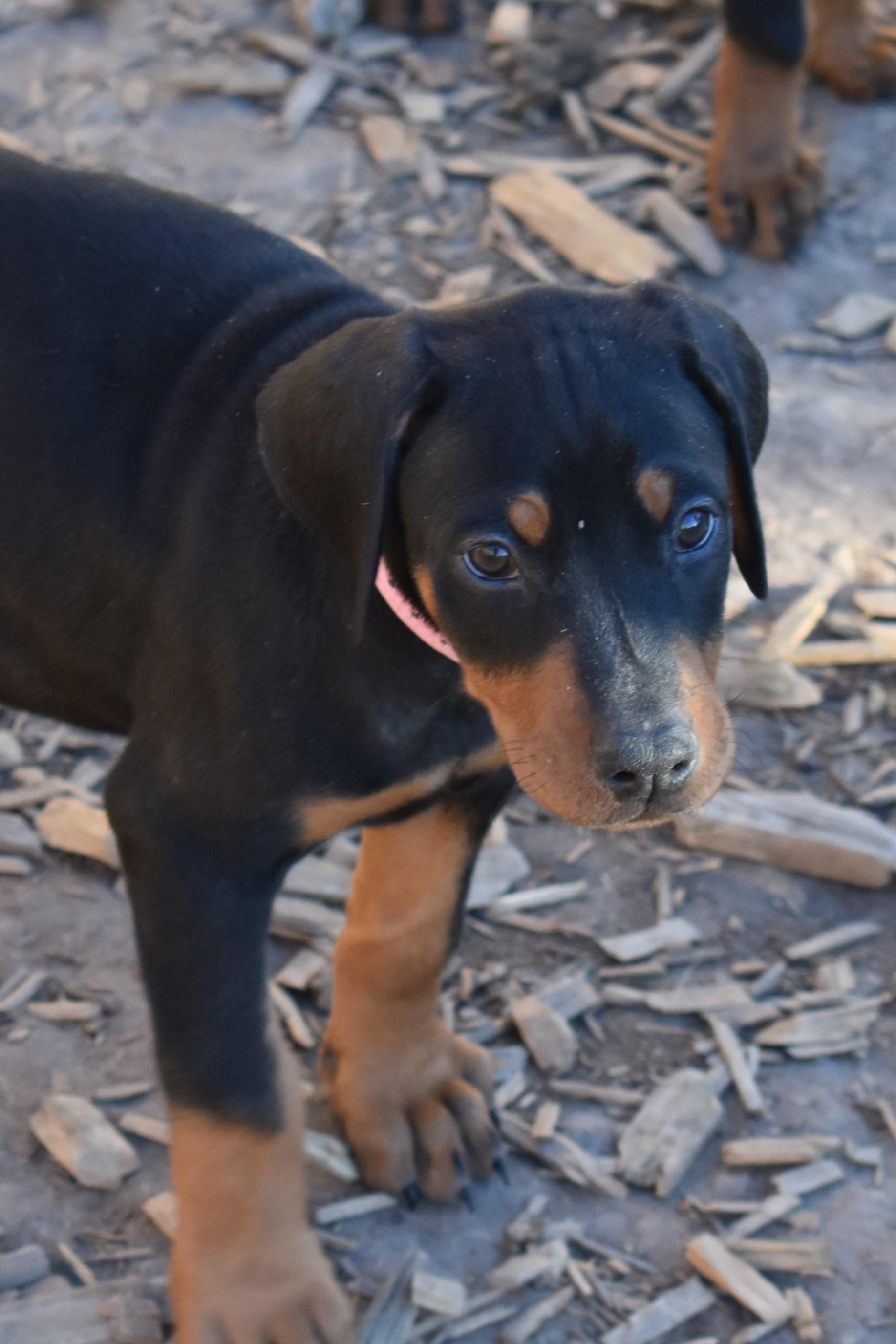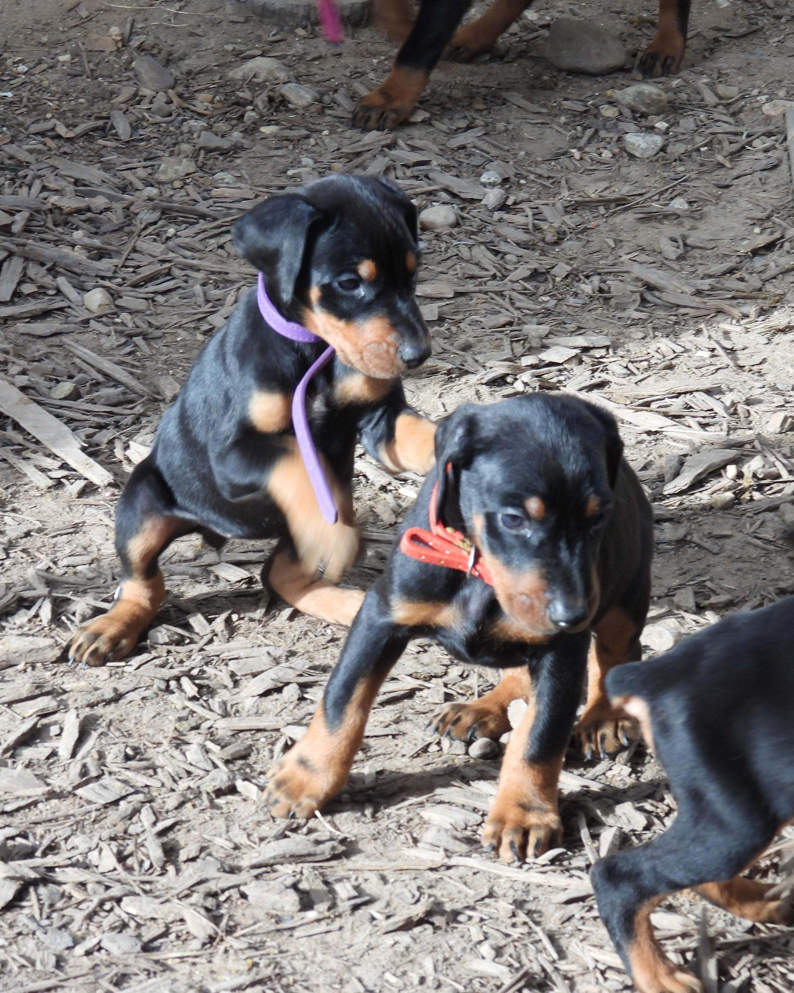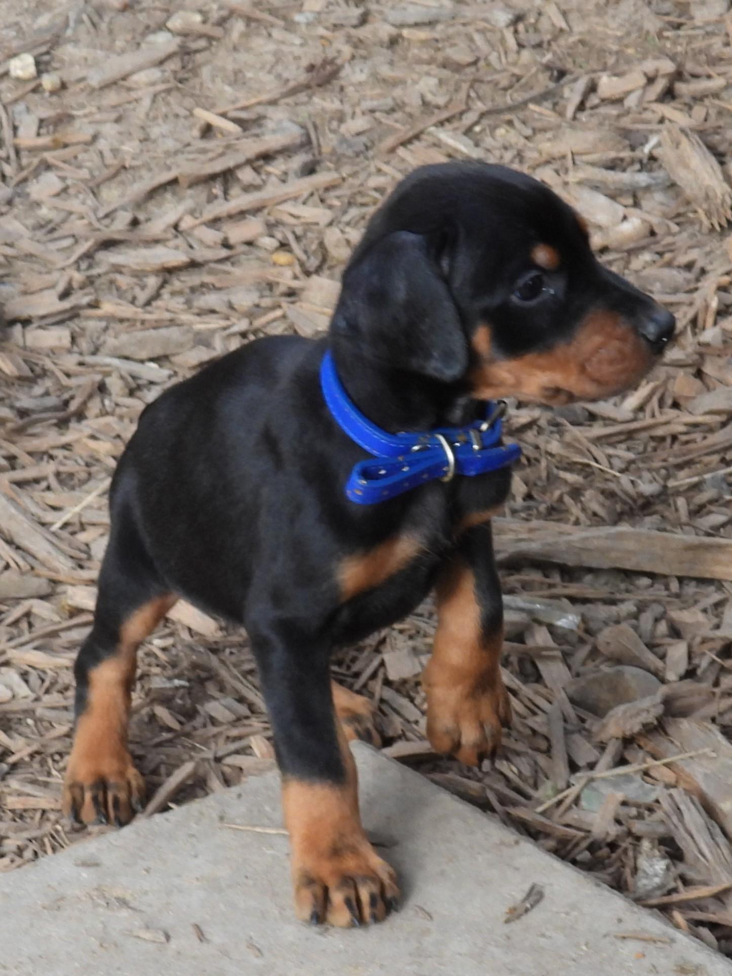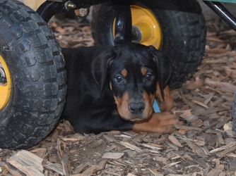 Our puppies include black and rust, blue and rust, fawn (isabella) and rust, and red and rust. Colors will vary depending on the parent dogs.
