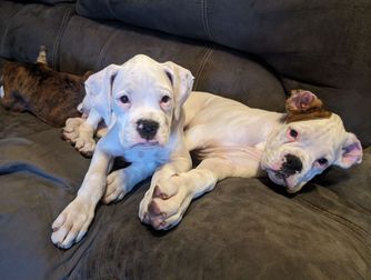 Our puppies include fawn, brindle, and white. Colors will vary depending on the parent dogs.