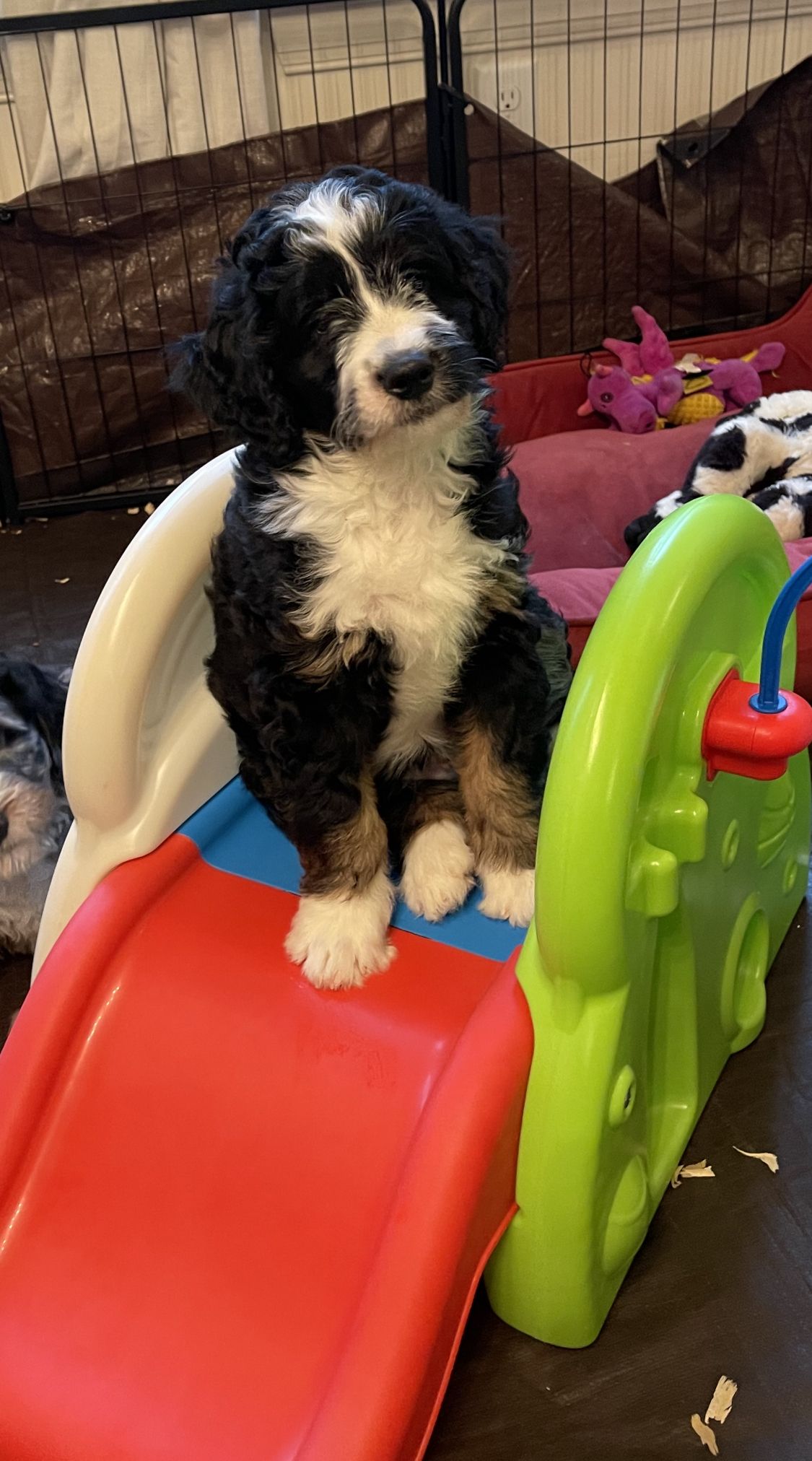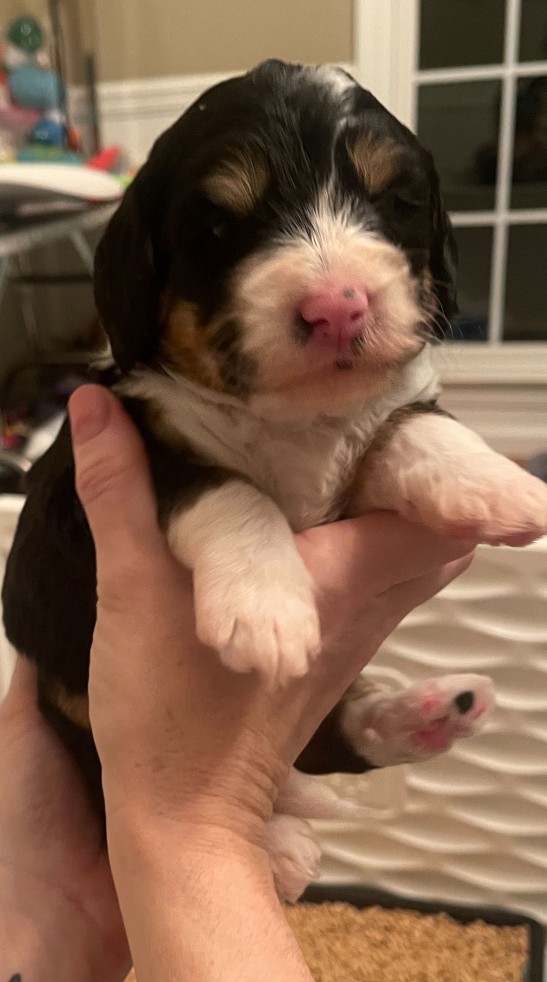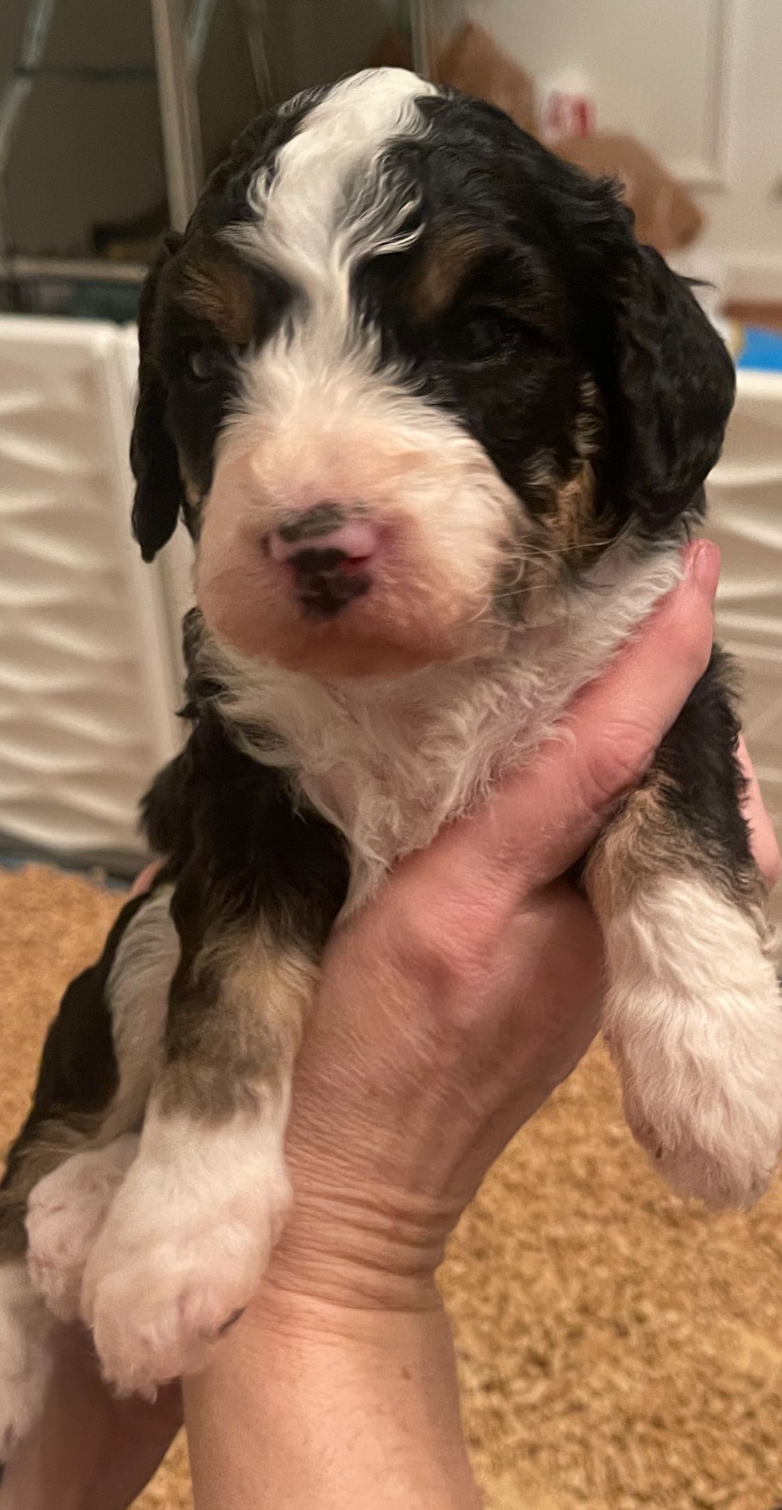 “Multigen bernedoodle puppies who come from fully health tested parents. They will come with a one year health guarantee, all age appropriate vaccinations, a puppy care pack, small bag of food and a blanket with mom’s scent.