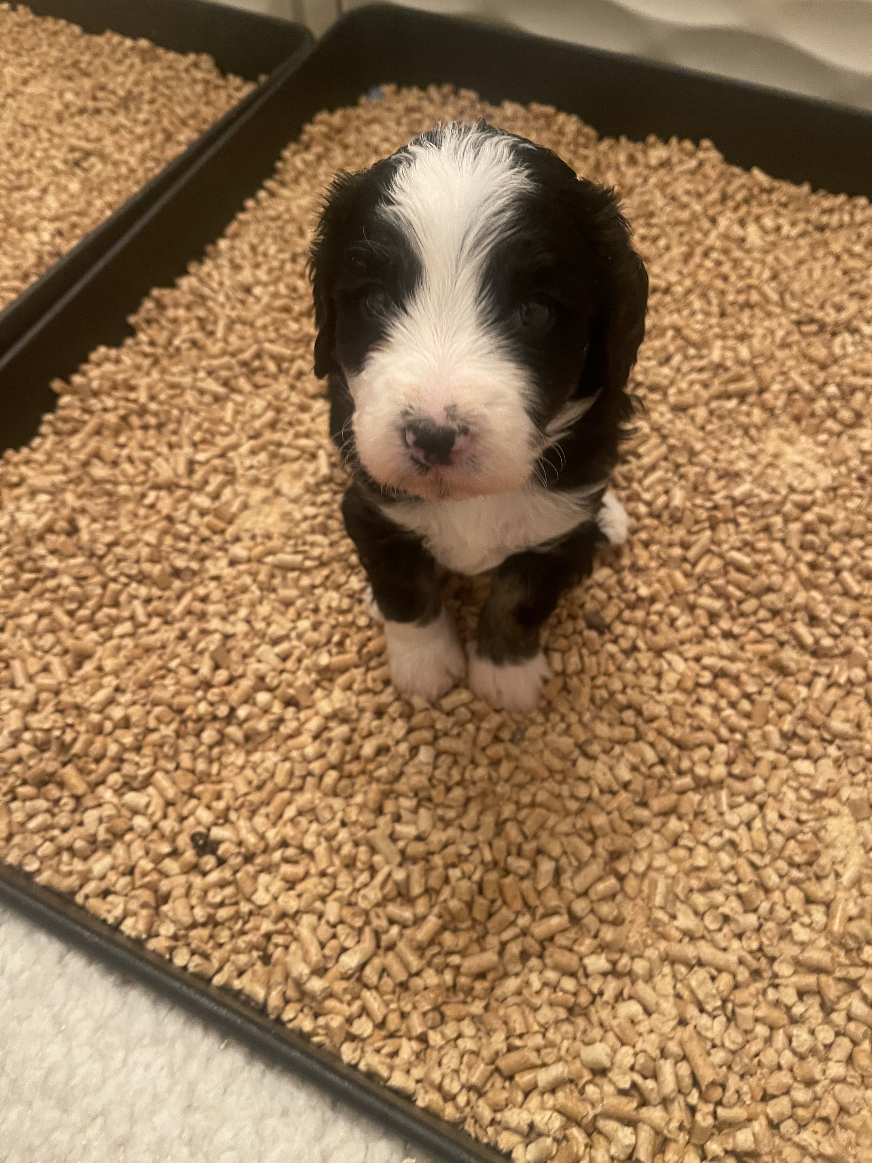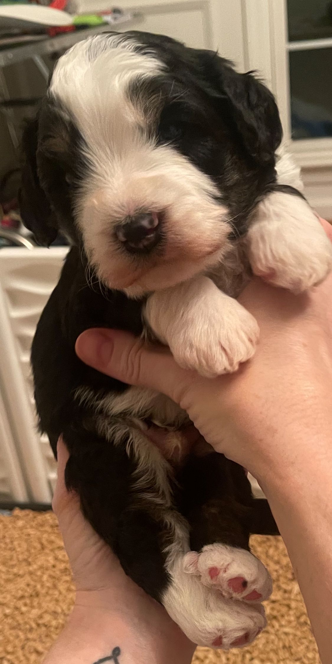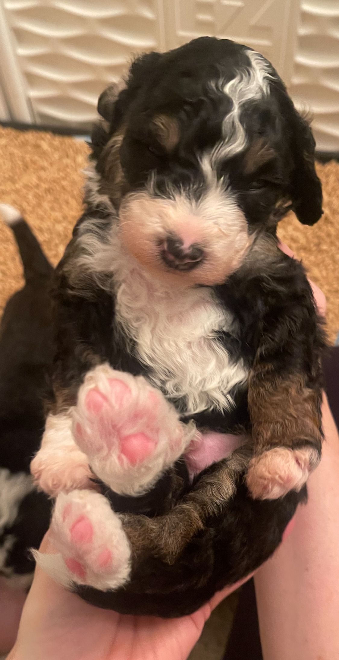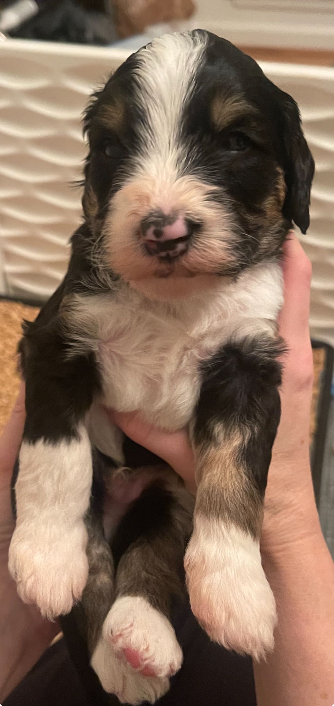 “Multigen bernedoodle puppies who come from fully health tested parents. They will come with a one year health guarantee, all age appropriate vaccinations, a puppy care pack, small bag of food and a blanket with mom’s scent.