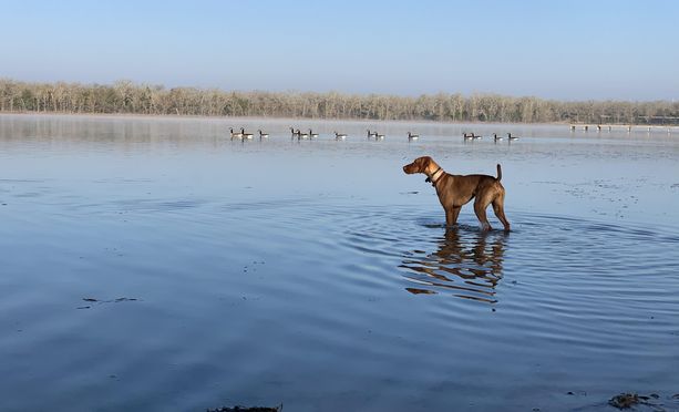 Oliver was our first Vizsla. Hiking and playing fetch are his favorite activities. He also enjoys a good "lean" into the legs.